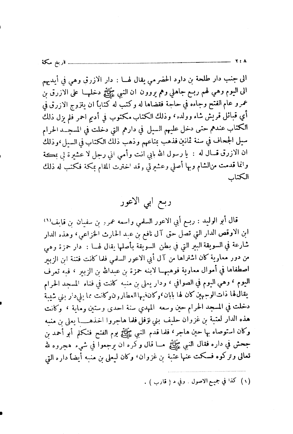 إِلَى جَنْبِ دَارِ طَلْحَةَ بْنِ دَاوُدَ الْحَضْرَمِيِّ، يُقَالُ لَهَا دَارُ الْأَزْرَقِ، وَهِيَ فِي أَيْدِيهِمْ إِلَى الْيَوْمِ، وَهِيَ لَهُمْ رَبْعٌ جَاهِلِيٌّ، وَهُمْ يَرْوُونَ أَنَّ النَّبِيَّ صَلَّى اللهُ عَلَيْهِ وَسَلَّمَ دَخَلَهَا عَلَى الْأَزْرَقِ بْنِ عَمْرٍو عَامَ الْفَتْحِ، وَجَاءَهُ فِي حَاجَةٍ فَقَضَاهَا لَهُ، وَكَتَبَ لَهُ كِتَابًا أَنْ يَتَزَوَّجَ الْأَزْرَقُ فِي أَيِّ قَبَائِلِ قُرَيْشٍ شَاءَ وَوَلَدُهُ، وَذَلِكَ الْكِتَابُ مَكْتُوبٌ فِي أَدِيمٍ أَحْمَرَ، فَلَمْ يَزَلْ ذَلِكَ الْكِتَابُ عِنْدَهُمْ حَتَّى دَخَلَ عَلَيْهِمُ السَّيْلُ فِي دَارِهِمُ الَّتِي دَخَلَتْ فِي الْمَسْجِدِ الْحَرَامِ سَيْلُ الْجُحَافِ فِي سَنَةِ ثَمَانِينَ، فَذَهَبَ بِمَتَاعِهِمْ، وَذَهَبَ ذَلِكَ الْكِتَابُ فِي السَّيْلِ، وَذَلِكَ أَنَّ الْأَزْرَقَ قَالَ لَهُ: يَا رَسُولَ اللَّهِ، بِأَبِي أَنْتَ وَأُمِّي، إِنِّي رَجُلٌ لَا عَشِيرَةَ لِي بِمَكَّةَ، وَإِنَّمَا قَدِمْتُ مِنَ الشَّامِ، وَبِهَا أَصْلِي وَعَشِيرَتِي، وَقَدِ اخْتَرْتُ الْمَقَامَ بِمَكَّةَ فَكَتَبَ لَهُ ذَلِكَ الْكِتَابَ