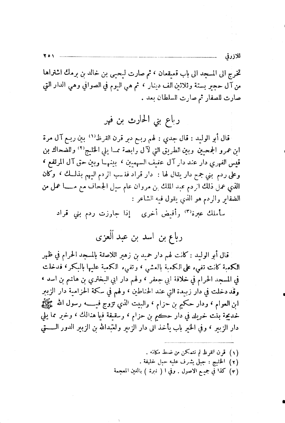 §رِبَاعُ ابْنِ أَسَدِ بْنِ عَبْدِ الْعُزَّى قَالَ أَبُو الْوَلِيدِ: كَانَتْ لَهُمْ دَارُ حُمَيْدِ بْنِ زُهَيْرٍ اللَّاصِقَةُ بِالْمَسْجِدِ الْحَرَامِ فِي ظَهْرِ الْكَعْبَةِ، كَانَتْ تَفِيءُ عَلَى الْكَعْبَةِ بِالْعَشِيِّ، وَتَفِيءُ الْكَعْبَةُ عَلَيْهَا بِالْبِكْرِ، فَدَخَلَتْ فِي الْمَسْجِدِ الْحَرَامِ فِي خِلَافَةِ أَبِي جَعْفَرٍ، وَلَهُمْ دَارُ أَبِي الْبَخْتَرِيِّ بْنِ هَاشِمِ بْنِ أَسَدٍ، وَقَدْ دَخَلَتْ فِي دَارِ زُبَيْدَةَ الَّتِي عِنْدَ الْحَنَّاطِينَ، وَلَهُمْ فِي سِكَّةِ الْحِزَامِيَّةِ دَارُ الزُّبَيْرِ بْنِ الْعَوَّامِ، وَدَارُ حَكِيمِ بْنِ حِزَامٍ، وَالْبَيْتُ الَّذِي تَزَوَّجَ فِيهِ رَسُولُ اللَّهِ صَلَّى اللهُ عَلَيْهِ وَسَلَّمَ خَدِيجَةَ بِنْتَ خُوَيْلِدٍ فِي دَارِ حَكِيمِ بْنِ حِزَامٍ، وَسَقِيفَةٌ فِيمَا هُنَالِكَ، وَخَيْرٌ مِمَّا يَلِي دَارَ الزُّبَيْرِ، وَفِي الْخَيْرِ بَابٌ يَأْخُذُ إِلَى دَارِ الزُّبَيْرِ، وَلِعَبْدِ اللَّهِ بْنِ الزُّبَيْرِ الدُّورُ الَّتِي