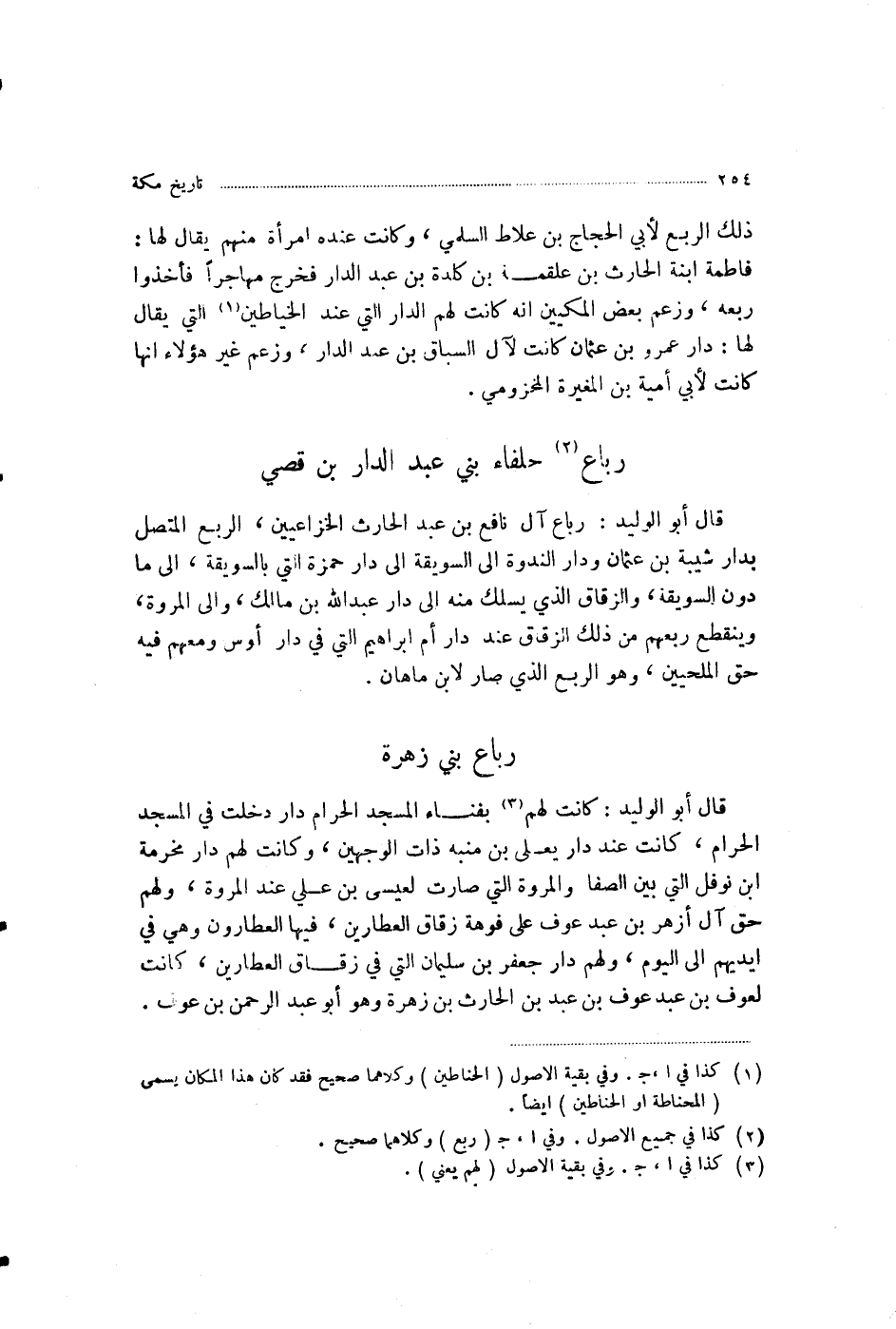 §رِبَاعُ حُلَفَاءِ بَنِي عَبْدِ الدَّارِ بْنِ قُصَيٍّ قَالَ أَبُو الْوَلِيدِ: رِبَاعُ آلِ نَافِعِ بْنِ عَبْدِ الْحَارِثِ الْخُزَاعِيِّينَ، الرَّبْعُ الْمُتَّصِلُ بِدَارِ شَيْبَةَ بْنِ عُثْمَانَ وَدَارِ النَّدْوَةِ إِلَى السُّوَيْقَةِ إِلَى دَارِ حَمْزَةَ الَّتِي بِالسُّوَيْقَةِ، إِلَى مَا دُونَ السُّوَيْقَةِ، وَالزُّقَاقِ الَّذِي يُسْلَكُ مِنْهُ إِلَى دَارِ عَبْدِ اللَّهِ بْنِ مَالِكٍ، وَإِلَى الْمَرْوَةِ، وَيَنْقَطِعُ رَبْعُهُمْ مِنْ ذَلِكَ الزُّقَاقِ عِنْدَ دَارِ أُمِّ إِبْرَاهِيمَ الَّتِي فِي دَارِ أَوْسٍ، وَمَعَهُمْ فِيهِ حَقُّ الْمِلْحِيِّينَ، وَهُوَ الرَّبْعُ الَّذِي صَارَ لِابْنِ مَاهَانَ