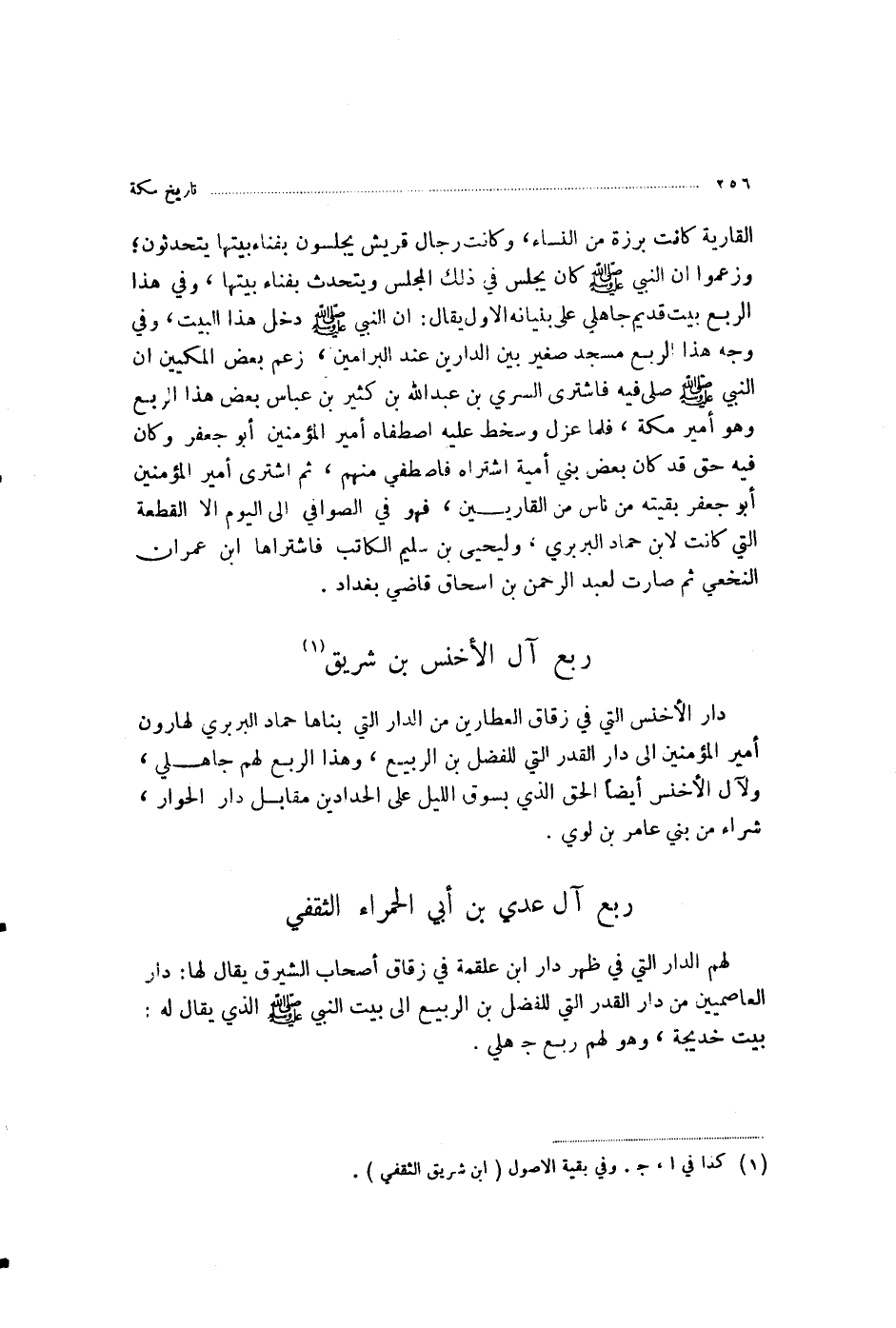 §رَبْعُ آلِ الْأَخْنَسِ بْنِ شَرِيقٍ دَارُ الْأَخْنَسِ الَّتِي فِي زُقَاقِ الْعَطَّارِينَ مِنَ الدَّارِ الَّتِي بَنَاهَا حَمَّادٌ الْبَرْبَرِيُّ لِهَارُونَ أَمِيرِ الْمُؤْمِنِينَ إِلَى دَارِ الْقَدْرِ الَّتِي لِلْفَضْلِ بْنِ الرَّبِيعِ، وَهَذَا الرَّبْعُ لَهُمْ جَاهِلِيٌّ، وَلِآلِ الْأَخْنَسِ أَيْضًا الْحَقُّ الَّذِي بِسُوقِ اللَّيْلِ عَلَى الْحَدَّادِينَ مُقَابِلَ دَارِ الْحُوَارِ، شِرَاءً مِنْ بَنِي عَامِرِ بْنِ لُؤَيٍّ