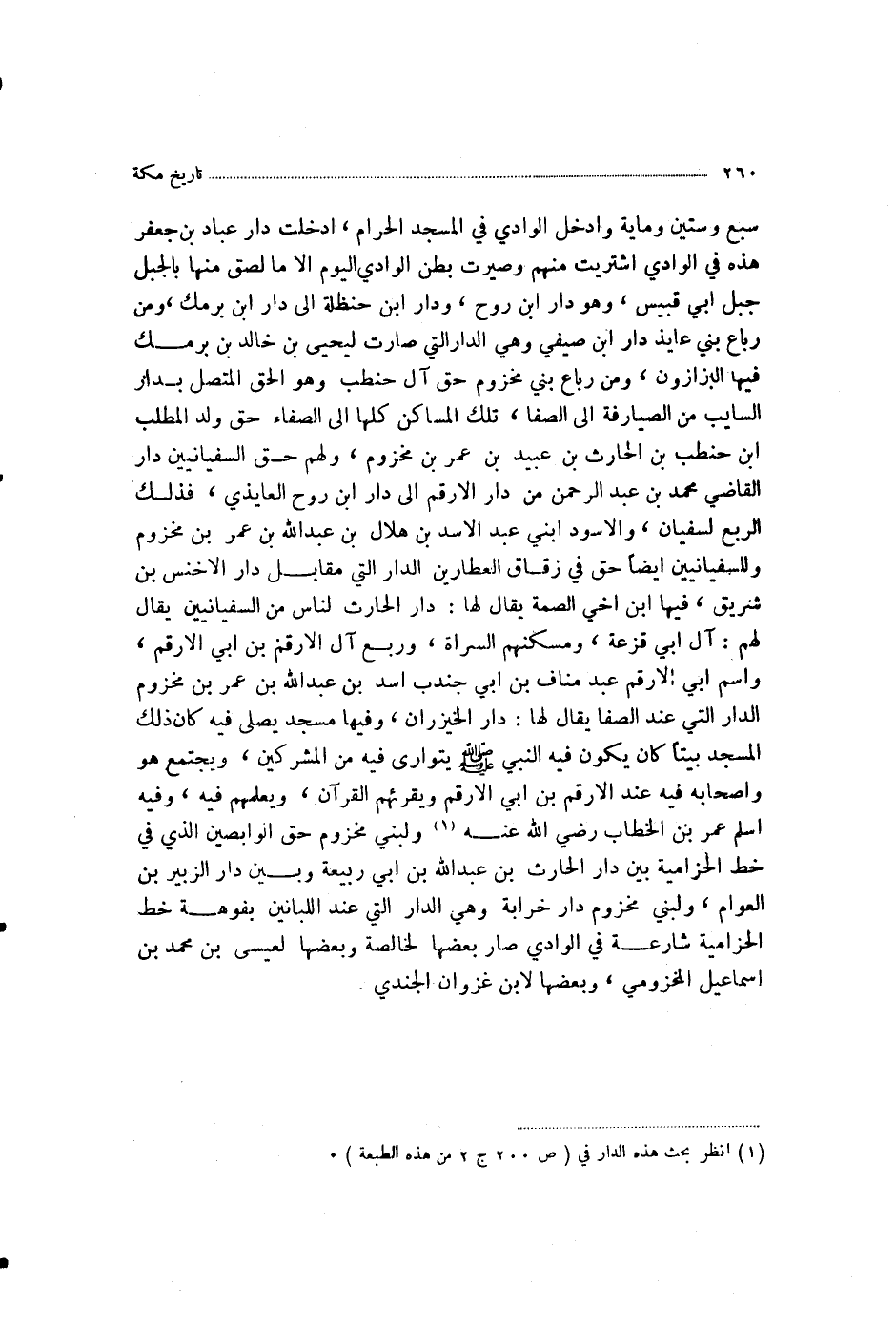 سَبْعٍ وَسِتِّينَ وَمِائَةٍ، وَأَدْخَلَ الْوَادِيَ فِي الْمَسْجِدِ الْحَرَامِ، أُدْخِلَتْ دَارُ عَبَّادِ بْنِ جَعْفَرٍ هَذِهِ فِي الْوَادِي، اشْتُرِيَتْ مِنْهُمْ، وَصُيِّرَتْ بَطْنَ الْوَادِي الْيَوْمَ، إِلَّا مَا لَصَقَ مِنْهَا بِالْجَبَلِ جَبَلِ أَبِي قُبَيْسٍ، وَهُوَ دَارُ ابْنِ رَوْحٍ، وَدَارُ ابْنِ حَنْظَلَةَ إِلَى دَارِ ابْنِ بَرْمَكَ، وَمِنْ رِبَاعِ بَنِي عَايِذٍ دَارُ ابْنِ صَيْفِيٍّ، وَهِيَ الدَّارُ الَّتِي صَارَتْ لِيَحْيَى بْنِ خَالِدِ بْنِ بَرْمَكَ، فِيهَا الْبَزَّازُونَ، وَمِنْ رِبَاعِ بَنِي مَخْزُومٍ حَقُّ آلِ حَنْطَبٍ، وَهُوَ الْحَقُّ الْمُتَّصِلُ بِدَارِ السَّائِبِ مِنَ الصَّيَارِفَةِ إِلَى الصَّفَا، تِلْكَ الْمَسَاكِنُ كُلُّهَا إِلَى الصَّفَاءِ حَقُّ وَلَدِ الْمُطَّلِبِ بْنِ حَنْطَبِ بْنِ الْحَارِثِ بْنِ عُبَيْدِ بْنِ عُمَرَ بْنِ مَخْزُومٍ، وَلَهُمْ حَقُّ السُّفْيَانِيِّينَ دَارُ الْقَاضِي مُحَمَّدِ بْنِ عَبْدِ الرَّحْمَنِ مِنْ دَارِ الْأَرْقَمِ إِلَى دَارِ ابْنِ رَوْحٍ الْعَايِذِيِّ، فَذَلِكَ الرَّبْعُ لِسُفْيَانَ وَالْأَسْوَدِ ابْنَيْ عَبْدِ الْأَسَدِ بْنِ هِلَالِ بْنِ عَبْدِ اللَّهِ بْنِ عُمَرَ بْنِ مَخْزُومٍ، وَلِلسُّفْيَانِيِّينَ أَيْضًا حَقٌّ فِي زُقَاقِ الْعَطَّارِينَ الدَّارُ الَّتِي مُقَابِلَ دَارِ الْأَخْنَسِ بْنِ شَرِيقٍ، فِيهَا ابْنُ أَخِي الصِّمَّةِ، يُقَالُ لَهَا دَارُ الْحَارِثِ، لِنَاسٍ مِنَ السُّفْيَانِيِّينَ يُقَالُ لَهُمْ آلُ أَبِي قَزَعَةَ، وَمَسْكَنُهُمُ السَّرَاةُ، وَرَبْعُ آلِ الْأَرْقَمِ بْنِ أَبِي الْأَرْقَمِ، وَاسْمُ أَبِي الْأَرْقَمِ عَبْدُ مَنَافِ بْنِ أَبِي جُنْدُبٍ أَسَدِ بْنِ عَبْدِ اللَّهِ بْنِ عُمَرَ بْنِ مَخْزُومٍ، الدَّارُ الَّتِي عِنْدَ الصَّفَا، يُقَالُ لَهَا دَارُ الْخَيْزُرَانِ، وَفِيهَا مَسْجِدٌ يُصَلَّى فِيهِ، كَانَ ذَلِكَ الْمَسْجِدُ بَيْتًا، كَانَ يَكُونُ فِيهِ النَّبِيُّ صَلَّى اللهُ عَلَيْهِ وَسَلَّمَ يَتَوَارَى فِيهَا مِنَ الْمُشْرِكِينَ، وَيَجْتَمِعُ هُوَ وَأَصْحَابُهُ فِيهَا عِنْدَ الْأَرْقَمِ بْنِ أَبِي الْأَرْقَمِ، وَيُقْرِئُهُمُ الْقُرْآنَ، وَيُعَلِّمُهُمْ فِيهِ، وَفِيهِ أَسْلَمَ عُمَرُ بْنُ الْخَطَّابِ رَضِيَ اللَّهُ عَنْهُ، وَلِبَنِي مَخْزُومٍ حَقُّ الْوَابِصِينَ فِي خَطِّ الْحِزَامِيَّةِ بَيْنَ دَارِ الْحَارِثِ بْنِ عَبْدِ اللَّهِ بْنِ أَبِي رَبِيعَةَ، وَبَيْنَ دَارِ الزُّبَيْرِ بْنِ الْعَوَّامِ، وَلِبَنِي مَخْزُومٍ دَارُ خُرَابَةَ، وَهِيَ الدَّارُ الَّتِي عِنْدَ اللِّبَانَيْنِ بِفُوَّهَةِ خَطِّ الْحِزَامِيَّةِ شَارِعَةٌ فِي الْوَادِي، صَارَ بَعْضُهَا لِخَالِصَةَ، وَبَعْضُهَا لِعِيسَى بْنِ مُحَمَّدِ بْنِ إِسْمَاعِيلَ الْمَخْزُومِيِّ، وَبَعْضُهَا لِابْنِ غَزْوَانَ الْجَنَدِيِّ