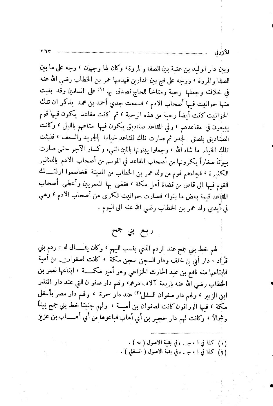 §رَبْعُ بَنِي جُمَحٍ لَهُمْ خَطُّ بَنِي جُمَحٍ عِنْدَ الرَّدْمِ الَّذِي يُنْسَبُ إِلَيْهِمْ، وَكَانَ يُقَالُ لَهُ رَدْمُ بَنِي قُرَادٍ، وَدَارُ أُبَيِّ بْنِ خَلَفٍ، وَدَارُ السِّجْنِ سِجْنِ مَكَّةَ، كَانَتْ لِصَفْوَانَ بْنِ أُمَيَّةَ، فَابْتَاعَهَا مِنْهُ نَافِعُ بْنُ عَبْدِ الْحَارِثِ الْخُزَاعِيُّ، وَهُوَ أَمِيرُ مَكَّةَ، ابْتَاعَهَا لِعُمَرَ بْنِ الْخَطَّابِ رَضِيَ اللَّهُ عَنْهُ بِأَرْبَعَةِ آلَافِ دِرْهَمٍ، وَلَهُمْ دَارُ صَفْوَانَ الَّتِي عِنْدَ دَارِ الْمُنْذِرِ بْنِ الزُّبَيْرِ، وَلَهُمْ دَارُ صَفْوَانَ السُّفْلَى عِنْدَ دَارِ سَمُرَةَ، وَلَهُمْ دَارُ مِصْرٍ بِأَسْفَلِ مَكَّةَ، فِيهَا الْوَرَّاقُونَ، كَانَتْ لِصَفْوَانَ بْنِ أُمَيَّةَ، وَلَهُمْ جَنَبَتَا خَطُّ بَنِي جُمَحٍ يَمِينًا وَشِمَالًا، وَكَانَتْ لَهُمْ دَارُ حُجَيْرِ بْنِ أَبِي إِهَابٍ، فَبَاعُوهَا مِنْ أَبِي إِهَابِ بْنِ عَزِيزٍ