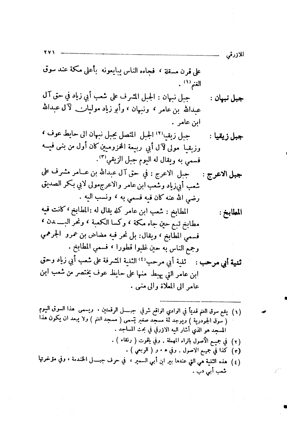 عَلَى قَرْنِ مَسْقَلَةَ، فَجَاءَهُ النَّاسُ يُبَايِعُونَهُ بِأَعْلَى مَكَّةَ عِنْدَ سُوقِ الْغَنَمِ " جَبَلُ نَبْهَانَ: الْجَبَلُ الْمُشْرِفُ عَلَى شِعْبِ أَبِي زِيَادٍ فِي حَقِّ آلِ عَبْدِ اللَّهِ بْنِ عَامِرٍ، وَنَبْهَانُ وَأَبُو زِيَادٍ مَوْلَيَانِ لِآلِ عَبْدِ اللَّهِ بْنِ عَامِرٍ جَبَلُ زِيقْيَا: الْجَبَلُ الْمُتَّصِلُ بِجَبَلِ نَبْهَانَ إِلَى حَائِطِ عَوْفٍ، وَزِيقْيَا مَوْلًى لِآلِ أَبِي رَبِيعَةَ الْمَخْزُومِيِّينَ كَانَ أَوَّلَ مَنْ بَنَى فِيهِ؛ فَسُمِّيَ بِهِ، وَيُقَالُ لَهُ الْيَوْمَ جَبَلُ الزِّيقِيِّ جَبَلُ الْأَعْرَجِ: فِي حَقِّ آلِ عَبْدِ اللَّهِ بْنِ عَامِرٍ، مُشْرِفٌ عَلَى شِعْبِ أَبِي زِيَادٍ، وَشِعْبِ ابْنِ عَامِرٍ، وَالْأَعْرَجُ مَوْلًى لِأَبِي بَكْرٍ الصِّدِّيقِ رَضِيَ اللَّهُ عَنْهُ، كَانَ فِيهِ فَسُمِّيَ بِهِ، وَنُسِبَ إِلَيْهِ الْمَطَابِخُ: شِعْبُ ابْنِ عَامِرٍ كُلُّهُ، يُقَالُ لَهُ الْمَطَابِخُ، كَانَتْ فِيهِ مَطَابِخُ تُبَّعٍ حِينَ جَاءَ مَكَّةَ، وَكَسَا الْكَعْبَةَ، وَنَحَرَ الْبُدْنَ، فَسُمِّيَ الْمَطَابِخَ وَيُقَالُ: بَلْ نَحَرَ فِيهِ مُضَاضُ بْنُ عَمْرٍو الْجُرْهُمِيُّ، وَجَمَعَ النَّاسَ بِهِ حِينَ غَلَبُوا قَطُورًا، فَسُمِّيَ الْمَطَابِخَ ثَنِيَّةُ أَبِي مَرْحَبٍ الثَّنِيَّةُ الْمُشْرِفَةُ عَلَى شِعْبِ أَبِي زِيَادٍ وَحَقِّ ابْنِ عَامِرٍ، الَّتِي يُهْبَطُ مِنْهَا عَلَى حَائِطِ عَوْفٍ، يُخْتَصَرُ مِنْ شِعْبِ ابْنِ عَامِرٍ إِلَى الْمَعْلَاةِ وَإِلَى مِنًى