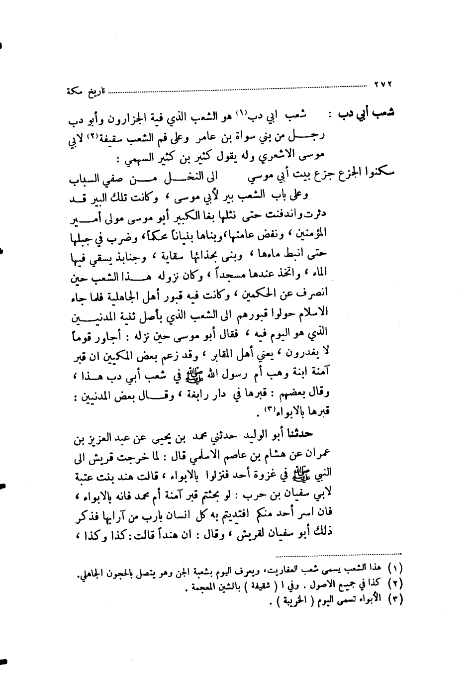 وَعَلَى بَابِ الشِّعْبِ بِئْرٌ لِأَبِي مُوسَى، وَكَانَتْ تِلْكَ الْبِيرُ قَدْ دَثَرَتْ وَانْدَفَنَتْ حَتَّى نَثَلَهَا بَغَا الْكَبِيرُ أَبُو مُوسَى مَوْلَى أَمِيرِ الْمُؤْمِنِينَ، وَنَفَضَ عَامَّتَهَا، وَبَنَاهَا بُنْيَانًا مُحْكَمًا، وَضَرَبَ فِي جَبَلِهَا حَتَّى أَنْبَطَ مَاءَهَا، وَبَنَى بِحِذَائِهَا سِقَايَةً وَجَنَابِذَ يُسْقَى فِيهَا الْمَاءُ، وَاتَّخَذَ عِنْدَهَا مَسْجِدًا، وَكَانَ نُزُولُهُ هَذَا الشِّعْبَ حِينَ انْصَرَفَ عَنِ الْحَكَمَيْنِ، وَكَانَتْ فِيهِ قُبُورُ أَهْلِ الْجَاهِلِيَّةِ، فَلَمَّا جَاءَ الْإِسْلَامُ حَوَّلُوا قُبُورَهُمْ إِلَى الشِّعْبِ الَّذِي بِأَصْلِ ثَنِيَّةِ الْمَدَنِيِّينَ الَّذِي هُوَ الْيَوْمَ فِيهِ، فَقَالَ أَبُو مُوسَى حِينَ نَزَلَهُ: أُجَاوِرُ قَوْمًا لَا يَغْدِرُونَ - يَعْنِي أَهْلَ الْمَقَابِرِ وَقَدْ زَعَمَ بَعْضُ الْمَكِّيِّينَ أَنَّ قَبْرَ آمِنَةَ بِنْتِ وَهْبٍ أُمِّ رَسُولِ اللَّهِ صَلَّى اللهُ عَلَيْهِ وَسَلَّمَ فِي شِعْبِ أَبِي دُبٍّ هَذَا وَقَالَ بَعْضُهُمْ: قَبْرُهَا فِي دَارِ رَابِغَةَ وَقَالَ بَعْضُ الْمَدَنِيِّينَ: قَبْرُهَا بِالْأَبْوَاءِ
