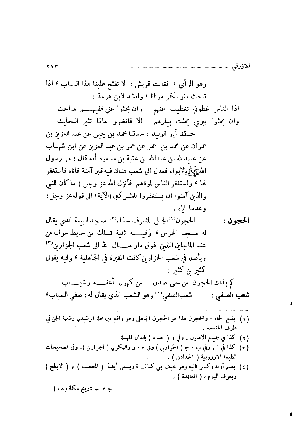 حَدَّثَنَا أَبُو الْوَلِيدِ، قَالَ: حَدَّثَنَا مُحَمَّدُ بْنُ يَحْيَى عَنْ عَبْدِ الْعَزِيزِ بْنِ عِمْرَانَ، عَنْ مُحَمَّدِ بْنِ عُمَرَ، عَنْ عُمَرَ بْنِ عَبْدِ الْعَزِيزِ، عَنِ ابْنِ شِهَابٍ، عَنْ عُبَيْدِ اللَّهِ بْنِ عَبْدِ اللَّهِ بْنِ عُتْبَةَ بْنِ مَسْعُودٍ، أَنَّهُ قَالَ: مَرَّ رَسُولُ اللَّهِ صَلَّى اللهُ عَلَيْهِ وَسَلَّمَ بِالْأَبْوَاءِ، فَعَدَلَ إِلَى شِعْبٍ هُنَاكَ فِيهِ قَبْرُ آمِنَةَ، فَأَتَاهُ فَاسْتَغْفَرَ لَهَا، وَاسْتَغْفَرَ النَّاسُ لِمَوْتَاهُمْ، فَأَنْزَلَ اللَّهُ عَزَّ وَجَلَّ: {§مَا كَانَ لِلنَّبِيِّ وَالَّذِينَ آمَنُوا أَنْ يَسْتَغْفِرُوا لِلْمُشْرِكِينَ} [التوبة: 113] الْآيَةَ، إِلَى قَوْلِهِ عَزَّ وَجَلَّ: {وَعَدَهَا إِيَّاهُ} [التوبة: 114] " الْحَجُونُ: الْجَبَلُ الْمُشْرِفُ حِذَاءَ مَسْجِدِ الْبَيْعَةِ الَّذِي يُقَالُ لَهُ مَسْجِدُ الْحَرَسِ، وَفِيهِ ثَنِيَّةٌ تُسْلَكُ مِنْ حَائِطِ عَوْفٍ مِنْ عِنْدِ الْمَاجِلَيْنِ اللَّذَيْنِ فَوْقَ دَارِ مَالِ اللَّهِ إِلَى شِعْبِ الْجَزَّارِينَ، وَبِأَصْلِهِ فِي شِعْبِ الْجَزَّارِينَ كَانَتِ الْمَقْبَرَةُ فِي الْجَاهِلِيَّةِ، وَفِيهِ يَقُولُ كَثِيرُ بْنُ كَثِيرٍ: