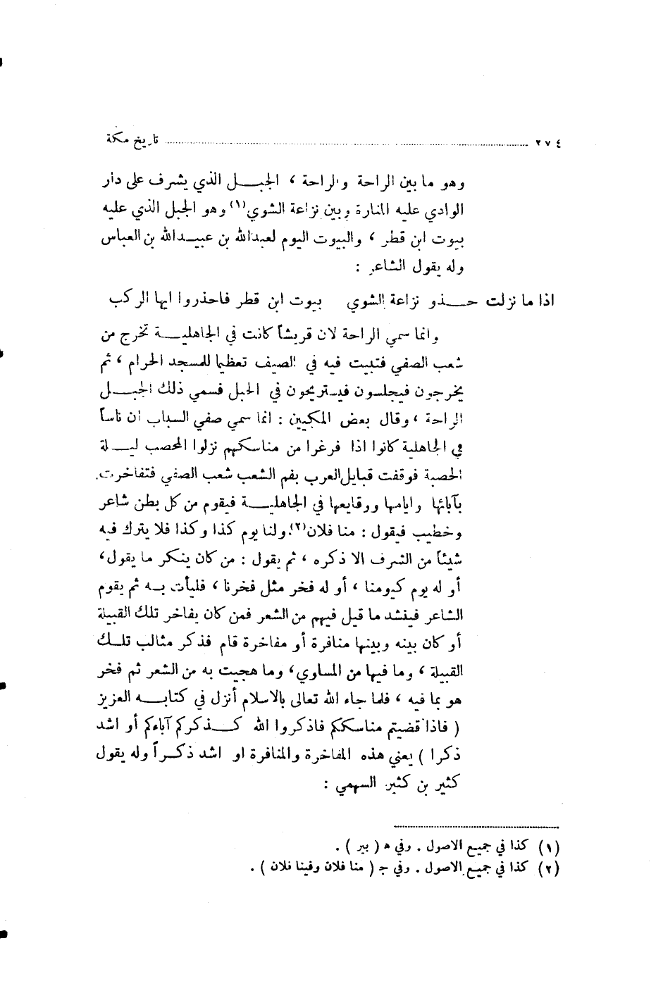 وَإِنَّمَا سُمِّيَ الرَّاحَةَ؛ لِأَنَّ قُرَيْشًا كَانَتْ فِي الْجَاهِلِيَّةِ تَخْرُجُ مِنْ شِعْبِ الصَّفِيِّ، فَتَبِيتُ فِيهِ فِي الصَّيْفِ تَعْظِيمًا لِلْمَسْجِدِ الْحَرَامِ، ثُمَّ يَخْرُجُونَ فَيَجْلِسُونَ فَيَسْتَرِيحُونَ فِي الْجَبَلِ، فَسُمِّيَ ذَلِكَ الْجَبَلُ الرَّاحَةَ وَقَالَ بَعْضُ الْمَكِّيِّينَ: إِنَّمَا سُمِّيَ صَفِيَّ السِّبَابِ؛ أَنَّ نَاسًا فِي الْجَاهِلِيَّةِ كَانُوا إِذَا فَرَغُوا مِنْ مَنَاسِكِهِمْ نَزَلُوا الْمُحَصَّبَ لَيْلَةَ الْحَصْبَةِ، فَوَقَفَتْ قَبَايِلُ الْعَرَبِ بِفَمِ الشِّعْبِ شِعْبِ الصَّفِيِّ، فَتَفَاخَرَتْ بِآبَائِهَا وَأَيَّامِهَا وَوَقَايِعِهَا فِي الْجَاهِلِيَّةِ، فَيَقُولُ مِنْ كُلِّ بَطْنٍ شَاعِرٌ وَخَطِيبٌ، فَيَقُولُ: مِنَّا فُلَانٌ، وَلَنَا يَوْمُ كَذَا وَكَذَا، فَلَا يَتْرُكُ فِيهِ شَيْئًا مِنَ الشَّرَفِ إِلَّا ذَكَرَهُ، ثُمَّ يَقُولُ: مَنْ كَانَ يُنْكِرُ مَا يَقُولُ، أَوْ لَهُ يَوْمٌ كَيَوْمِنَا، أَوْ لَهُ فَخْرٌ مِثْلُ فَخْرِنَا، فَلْيَأْتِ بِهِ ثُمَّ يَقُومُ الشَّاعِرُ فَيُنْشِدُ مَا قِيلَ فِيهِمْ مِنَ الشِّعْرِ، فَمَنْ كَانَ يُفَاخِرُ تِلْكَ الْقَبِيلَةَ، أَوْ كَانَ بَيْنَهُ وَبَيْنَهَا مُنَافَرَةٌ أَوْ مُفَاخَرَةٌ، قَامَ فَذَكَرَ مَثَالِبَ تِلْكَ الْقَبِيلَةِ، وَمَا فِيهَا مِنَ الْمَسَاوِئِ، وَمَا هُجِيَتْ بِهِ مِنَ الشِّعْرِ، ثُمَّ فَخَرَ هُوَ بِمَا فِيهِ فَلَمَّا جَاءَ اللَّهُ تَعَالَى بِالْإِسْلَامِ أَنْزَلَ فِي كِتَابِهِ الْعَزِيزِ: {فَإِذَا قَضَيْتُمْ مَنَاسِكَكُمْ فَاذْكُرُوا اللَّهَ كَذِكْرِكُمْ آبَاءَكُمْ أَوْ أَشَدَّ ذِكْرًا} [البقرة: 200] ، يَعْنِي هَذِهِ الْمُفَاخَرَةَ وَالْمُنَافَرَةَ أَوْ أَشَدَّ ذِكْرًا وَلَهُ يَقُولُ كَثِيرُ بْنُ كَثِيرٍ السَّهْمِيُّ