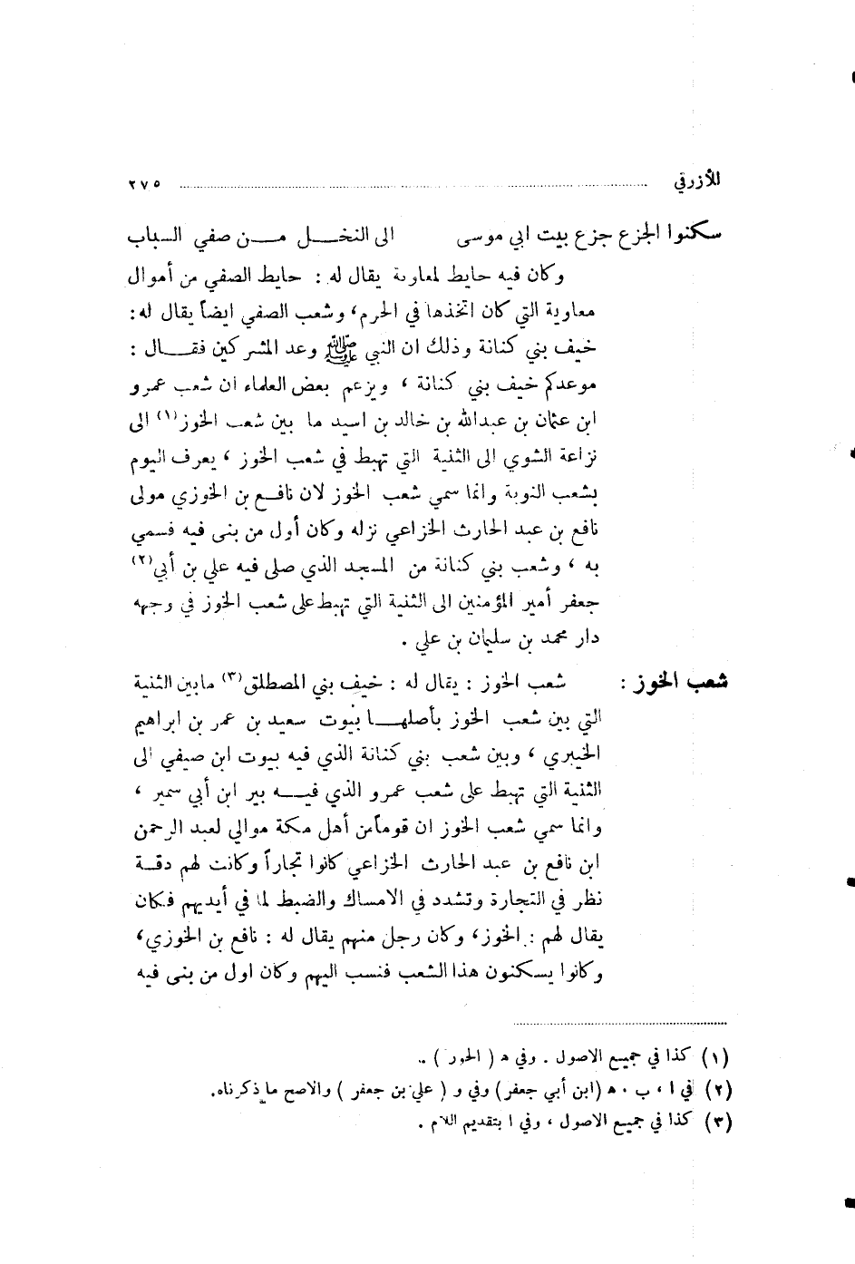 وَكَانَ فِيهِ حَائِطٌ لِمُعَاوِيَةَ، يُقَالُ لَهُ حَائِطُ الصَّفِيِّ، مِنْ أَمْوَالِ مُعَاوِيَةَ الَّتِي كَانَ اتَّخَذَهَا فِي الْحَرَمِ وَشِعْبُ الصَّفِيِّ أَيْضًا يُقَالُ لَهُ خَيْفُ بَنِي كِنَانَةَ، وَذَلِكَ أَنَّ النَّبِيَّ صَلَّى اللهُ عَلَيْهِ وَسَلَّمَ وَعَدَ الْمُشْرِكِينَ، فَقَالَ: «مَوْعِدُكُمْ خَيْفُ بَنِي كِنَانَةَ» وَيَزْعُمُ بَعْضُ الْعُلَمَاءِ أَنَّ شِعْبَ عَمْرِو بْنِ عُثْمَانَ بْنِ عَبْدِ اللَّهِ بْنِ خَالِدِ بْنِ أَسِيدٍ مَا بَيْنَ شِعْبِ الْخُوزِ إِلَى نَزَّاعَةِ الشَّوَى إِلَى الثَّنِيَّةِ الَّتِي تَهْبِطُ فِي شِعْبِ الْخُوزِ، يُعْرَفُ الْيَوْمَ بِشِعْبِ النُّوبَةِ، وَإِنَّمَا سُمِّيَ شِعْبَ الْخُوزِ؛ لِأَنَّ نَافِعَ بْنَ الْخُوزِيِّ مَوْلَى نَافِعِ بْنِ عَبْدِ الْحَارِثِ الْخُزَاعِيِّ نَزَلَهُ، وَكَانَ أَوَّلَ مَنْ بَنَى فِيهِ، فَسُمِّيَ بِهِ وَشِعْبُ بَنِي كِنَانَةَ مِنَ الْمَسْجِدِ الَّذِي صَلَّى فِيهِ عَلِيُّ بْنُ أَبِي جَعْفَرٍ أَمِيرُ الْمُؤْمِنِينَ إِلَى الثَّنِيَّةِ الَّتِي تَهْبِطُ عَلَى شِعْبِ الْخُوزِ، فِي وَجْهِهِ دَارُ مُحَمَّدِ بْنِ سُلَيْمَانَ بْنِ عَلِيٍّ شِعْبُ الْخُوزِ: يُقَالُ لَهُ خَيْفُ بَنِي الْمُصْطَلِقِ، مَا بَيْنَ الثَّنِيَّةِ الَّتِي بَيْنَ شِعْبِ الْخُوزِ بِأَصْلِهَا بُيُوتُ سَعِيدِ بْنِ عُمَرَ بْنِ إِبْرَاهِيمَ الْخَيْبَرِيِّ، وَبَيْنَ شِعْبِ بَنِي كِنَانَةَ الَّذِي فِيهِ بُيُوتُ ابْنِ صَفِيٍّ إِلَى الثَّنِيَّةِ الَّتِي تَهْبِطُ عَلَى شِعْبِ عَمْرٍو الَّذِي فِيهِ بِئْرُ ابْنِ أَبِي سُمَيْرٍ، وَإِنَّمَا سُمِّيَ شِعْبَ الْخُوزِ؛ أَنَّ قَوْمًا مِنْ أَهْلِ مَكَّةَ مَوَالِيَ لِعَبْدِ الرَّحْمَنِ بْنِ نَافِعِ بْنِ عَبْدِ الْحَارِثِ الْخُزَاعِيِّ كَانُوا تُجَّارًا، وَكَانَتْ لَهُمْ دِقَّةُ نَظَرٍ فِي التِّجَارَةِ، وَتَشَدُّدٌ فِي الْإِمْسَاكِ وَالضَّبْطِ لِمَا فِي أَيْدِيهِمْ، فَكَانَ يُقَالُ لَهُمُ الْخُوزُ، وَكَانَ رَجُلٌ مِنْهُمْ يُقَالُ لَهُ نَافِعُ بْنُ الْخُوزِيِّ، وَكَانُوا يَسْكُنُونَ هَذَا الشِّعْبَ، فَنُسِبَ إِلَيْهِمْ، وَكَانَ أَوَّلَ مَنْ بَنَى فِيهِ
