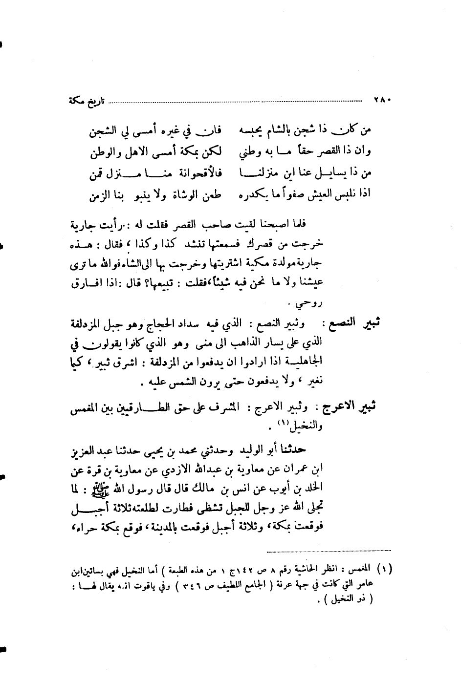 فَلَمَّا أَصْبَحْنَا لَقِيتُ صَاحِبَ الْقَصْرِ، فَقُلْتُ لَهُ: رَأَيْتُ جَارِيَةً خَرَجَتْ مِنْ قَصْرِكَ، فَسَمِعْتُهَا تُنْشِدُ كَذَا وَكَذَا فَقَالَ: هَذِهِ جَارِيَةٌ مُوَلَّدَةٌ مَكِّيَّةٌ، اشْتَرَيْتُهَا وَخَرَجْتُ بِهَا إِلَى الشَّامِ، فَوَاللَّهِ مَا تَرَى عَيْشَنَا وَلَا مَا نَحْنُ فِيهِ شَيْئًا فَقُلْتُ: تَبِيعُهَا؟ قَالَ: إِذًا أُفَارِقَ رُوحِي " وَثَبِيرُ النَّصْعِ: الَّذِي فِيهِ سِدَادُ الْحَجَّاجِ، وَهُوَ جَبَلُ الْمُزْدَلِفَةِ الَّذِي عَلَى يَسَارِ الذَّاهِبِ إِلَى مِنًى، وَهُوَ الَّذِي كَانُوا يَقُولُونَ فِي الْجَاهِلِيَّةِ إِذَا أَرَادُوا أَنْ يَدْفَعُوا مِنَ الْمُزْدَلِفَةِ: أَشْرِقْ ثَبِيرُ، كَيْمَا نُغِيرُ وَلَا يَدْفَعُونَ حَتَّى يَرَوْنَ الشَّمْسَ عَلَيْهِ وَثَبِيرُ الْأَعْرَجِ: الْمُشْرِفُ عَلَى حَقِّ الطَّارِقِيِّينَ بَيْنَ الْمُغَمَّسِ وَالنَّخِيلِ