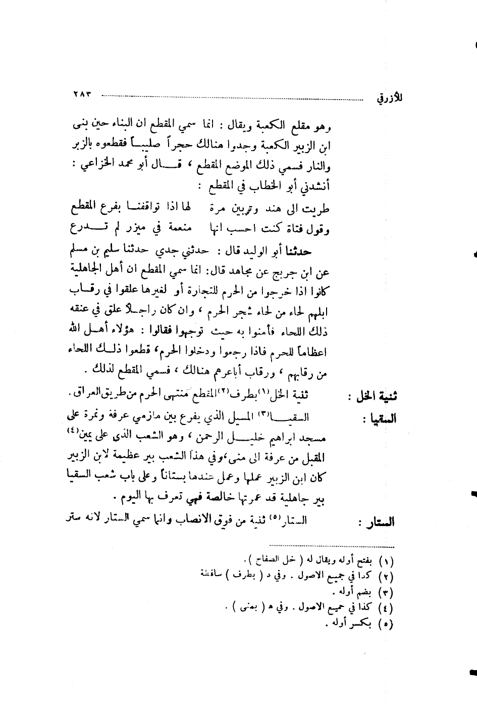 حَدَّثَنَا أَبُو الْوَلِيدِ، قَالَ: حَدَّثَنِي جَدِّي، حَدَّثَنَا سُلَيْمُ بْنُ مُسْلِمٍ، عَنِ ابْنِ جُرَيْجٍ، عَنْ مُجَاهِدٍ، قَالَ: إِنَّمَا سُمِّيَ الْمُقَطَّعَ؛ أَنَّ أَهْلَ الْجَاهِلِيَّةِ §كَانُوا إِذَا خَرَجُوا مِنَ الْحَرَمِ لِلتِّجَارَةِ أَوْ لِغَيْرِهَا عَلَّقُوا فِي رِقَابِ إِبِلِهِمْ لِحَاءً مِنْ لِحَاءِ شَجَرِ الْحَرَمِ، وَإِنْ كَانَ رَاجِلًا عَلَّقَ فِي عُنُقِهِ ذَلِكَ اللِّحَاءَ فَأَمِنُوا بِهِ حَيْثُ تَوَجَّهُوا، فَقَالُوا: هَؤُلَاءِ أَهْلُ اللَّهِ إِعْظَامًا لِلْحَرَمِ، فَإِذَا رَجَعُوا وَدَخَلُوا الْحَرَمَ، قَطَعُوا ذَلِكَ اللِّحَاءَ مِنْ رِقَابِهِمْ، وَرِقَابِ أَبَاعِرِهِمْ هُنَالِكَ فَسُمِّيَ الْمُقَطَّعَ لِذَلِكَ " ثَنِيَّةُ الْخَلِّ: بِطَرَفِ الْمُقَطَّعِ، مُنْتَهَى الْحَرَمِ مِنْ طَرِيقِ الْعِرَاقِ السُّقْيَا: الْمَسِيلُ الَّذِي يَفْرَعُ بَيْنَ مَأْزِمَيْ عَرَفَةَ وَنَمِرَةَ عَلَى مَسْجِدِ إِبْرَاهِيمَ خَلِيلِ الرَّحْمَنِ، وَهُوَ الشِّعْبُ الَّذِي عَلَى يَمِينِ الْمُقْبِلِ مِنْ عَرَفَةَ إِلَى مِنًى، وَفِي هَذَا الشِّعْبِ بِئْرٌ عَظِيمَةٌ لِابْنِ الزُّبَيْرِ، كَانَ ابْنُ الزُّبَيْرِ عَمِلَهَا وَعَمِلَ عِنْدَهَا بُسْتَانًا، وَعَلَى بَابِ شِعْبِ السُّقْيَا بِئْرٌ جَاهِلِيَّةٌ قَدْ عَمَرَتْهَا خَالِصَةُ، فَهِيَ تُعْرَفُ بِهَا الْيَوْمَ السِّتَارُ: ثَنِيَّةٌ مِنْ فَوْقِ الْأَنْصَابِ، وَإِنَّمَا سُمِّيَ السِّتَارَ، لِأَنَّهُ سِتْرٌ