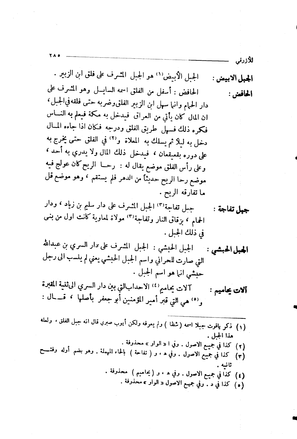 الْجَبَلُ الْأَبْيَضُ: وَهُوَ الْجَبَلُ الْمُشْرِفُ عَلَى فَلَقِ ابْنِ الزُّبَيْرِ الْحَافِضُ: أَسْفَلَ مِنَ الْفَلَقِ، اسْمُهُ السَّايِلُ، وَهُوَ الْمُشْرِفُ عَلَى دَارِ الْحَمَّامِ، وَإِنَّمَا سَهَّلَ ابْنُ الزُّبَيْرِ الْفَلَقَ وَضَرَبَهُ حَتَّى فَلَقَهُ فِي الْجَبَلِ؛ أَنَّ الْمَالَ كَانَ يَأْتِي مِنَ الْعِرَاقِ، فَيَدْخُلُ بِهِ مَكَّةَ، فَيَعْلَمُ بِهِ النَّاسُ، فَكَرِهَ ذَلِكَ، فَسَهَّلَ طَرِيقَ الْفَلَقِ وَدَرَجَهُ، فَكَانَ إِذَا جَاءَهُ الْمَالُ دَخَلَ بِهِ لَيْلًا، ثُمَّ يَسْلُكُ بِهِ الْمَعْلَاةَ وَفِي الْفَلَقِ، حَتَّى يَخْرُجَ بِهِ عَلَى دُورِهِ بِقُعَيْقِعَانَ، فَيَدْخُلُ ذَلِكَ الْمَالُ، وَلَا يَدْرِي بِهِ أَحَدٌ وَعَلَى رَأْسِ الْفَلَقِ مَوْضِعٌ يُقَالُ لَهُ رَحَا الرِّيحِ، كَانَ عُولِجَ فِيهِ مَوْضِعُ رَحَا الرِّيحِ حَدِيثًا مِنَ الدَّهْرِ فَلَمْ يَسْتَقِمْ، وَهُوَ مَوْضِعٌ قَلَّ مَا تُفَارِقُهُ الرِّيحُ جَبَلُ تُفَاجَةَ: الْجَبَلُ الْمُشْرِفُ عَلَى دَارِ سُلَيْمِ بْنِ زِيَادٍ، وَدَارِ الْحَمَّامِ بِزُقَاقِ النَّارِ، وَتُفَاجَةُ مَوْلَاةٌ لِمُعَاوِيَةَ، كَانَتْ أَوَّلَ مَنْ بَنَى فِي ذَلِكَ الْجَبَلِ الْجَبَلُ الْحَبَشِيُّ: الْجَبَلُ الْمُشْرِفُ عَلَى دَارِ السَّرِيِّ بْنِ عَبْدِ اللَّهِ الَّتِي صَارَتْ لِلْحَرَّانِيِّ، وَاسْمُ الْجَبَلِ الْحَبَشِيُّ، يَعْنِي لَمْ يُنْسَبْ إِلَى رَجُلٍ حَبَشِيٍّ، إِنَّمَا هُوَ اسْمُ الْجَبَلِ آلَاتُ يَحَامِيمَ: الْأَحْدَابُ الَّتِي بَيْنَ دَارِ السَّرِيِّ إِلَى ثَنِيَّةِ الْمَقْبَرَةِ، وَهِيَ الَّتِي قُبِرَ أَمِيرُ الْمُؤْمِنِينَ أَبُو جَعْفَرٍ بِأَصْلِهَا قَالَ