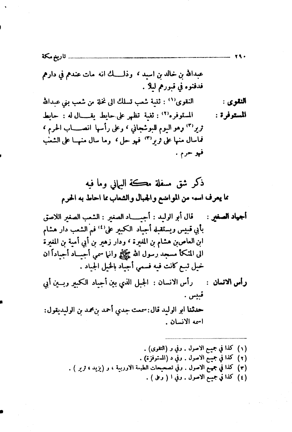 §ذِكْرُ شِقِّ مَسْفَلَةِ مَكَّةَ الْيَمَانِيِّ وَمَا فِيهِ مِمَّا يُعْرَفُ اسْمُهُ مِنَ الْمَوَاضِعِ وَالْجِبَالِ وَالشِّعَابِ مِمَّا أَحَاطَ بِهِ الْحَرَمُ قَالَ أَبُو الْوَلِيدِ: أَجْيَادٌ الصَّغِيرُ الشِّعْبُ الصَّغِيرُ اللَّاصِقُ بِأَبِي قُبَيْسٍ، وَيسْتَقْبِلُهُ أَجْيَادٌ الْكَبِيرُ، عَلَى فَمِ الشِّعْبِ دَارُ هِشَامِ بْنِ الْعَاصِ بْنِ هِشَامِ بْنِ الْمُغِيرَةِ، وَدَارُ زُهَيْرِ بْنِ أَبِي أُمَيَّةَ بْنِ الْمُغِيرَةِ إِلَى الْمُتَّكَأِ مَسْجِدِ رَسُولِ اللَّهِ صَلَّى اللهُ عَلَيْهِ وَسَلَّمَ، وَإِنَّمَا سُمِّيَ أَجْيَادٌ أَجْيَادًا؛ أَنَّ خَيْلَ تُبَّعٍ كَانَتْ فِيهِ، فَسُمِّيَ أَجْيَادٌ بِالْخَيْلِ الْجِيَادِ رَأْسُ الْإِنْسَانِ: الْجَبَلُ الَّذِي بَيْنَ أَجْيَادٍ الْكَبِيرِ وَبَيْنَ أَبِي قُبَيْسٍ حَدَّثَنَا أَبُو الْوَلِيدِ، قَالَ: سَمِعْتُ جَدِّي أَحْمَدَ بْنَ مُحَمَّدِ بْنِ الْوَلِيدِ يَقُولُ: اسْمُهُ الْإِنْسَانُ