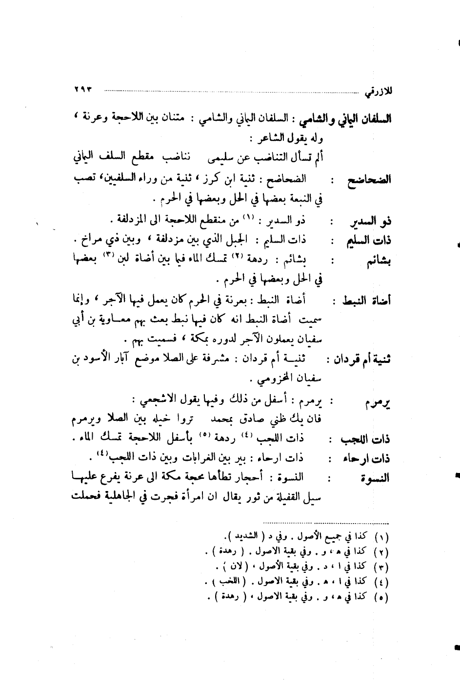 الضَّحَاضِحُ: ثَنِيَّةُ ابْنِ كُرْزٍ، ثَنِيَّةٌ مِنْ وَرَاءِ السَّلَفَيْنِ، تَصُبُّ فِي النَّبْعَةِ، بَعْضُهَا فِي الْحِلِّ وَبَعْضُهَا فِي الْحَرَمِ ذُو السَّدِيرِ: مِنْ مُنْقَطَعِ اللَّاحِجَةِ إِلَى الْمُزْدَلِفَةِ ذَاتُ السَّلِيمِ: الْجَبَلُ الَّذِي بَيْنَ مُزْدَلِفَةَ، وَبَيْنَ ذِي مُرَاخٍ بَشَائِمُ: رَدْهَةٌ تُمْسِكُ الْمَاءَ فِيمَا بَيْنَ أَضَاةِ لِبْنٍ، بَعْضُهَا فِي الْحِلِّ وَبَعْضُهَا فِي الْحَرَمِ أَضَاةُ النَّبَطِ: بِعُرَنَةَ فِي الْحَرَمِ، كَانَ يُعْمَلُ فِيهَا الْآجُرُّ، وَإِنَّمَا سُمِّيَتْ أَضَاةَ النَّبَطِ؛ أَنَّهُ كَانَ فِيهَا نَبَطٌ بَعَثَ بِهِمْ مُعَاوِيَةُ بْنُ أَبِي سُفْيَانَ يَعْمَلُونَ الْآجُرَّ لِدُورِهِ بِمَكَّةَ، فَسُمِّيَتْ بِهِمْ. ثَنِيَّةُ أُمُّ قِرْدَانٍ مُشْرِفَةٌ عَلَى الصَّلَا مَوْضِعِ آبَارِ الْأَسْوَدِ بْنِ سُفْيَانَ الْمَخْزُومِيِّ. يَرَمْرَمُ: أَسْفَلَ مِنْ ذَلِكَ، وَفِيهَا يَقُولُ الْأَشْجَعِيُّ: