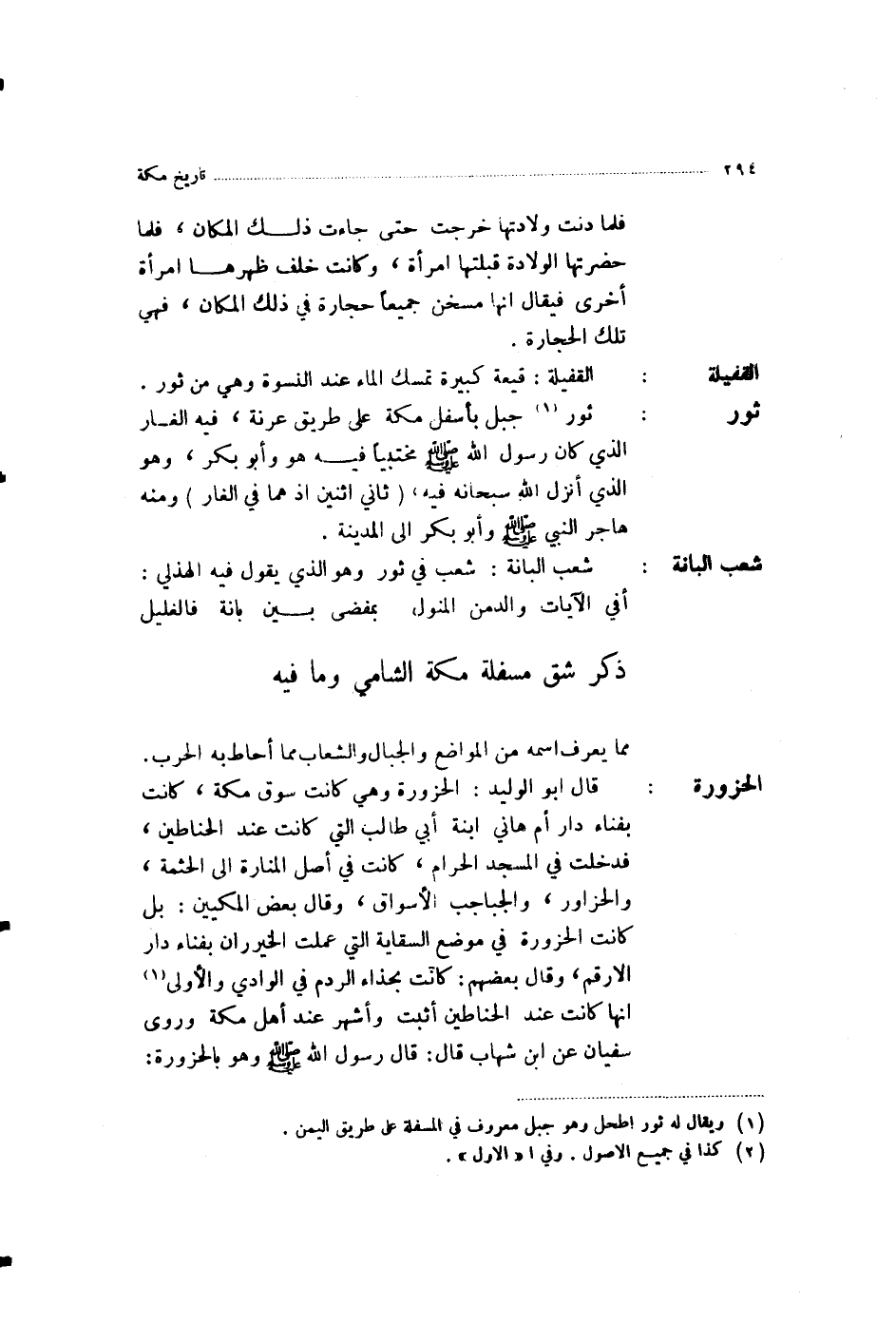 §ذِكْرُ شِقِّ مَسْفَلَةِ مَكَّةَ الشَّامِيِّ وَمَا فِيهِ مِمَّا يُعْرَفُ اسْمُهُ مِنَ الْمَوَاضِعِ وَالْجِبَالِ وَالشِّعَابِ مِمَّا أَحَاطَ بِهِ الْحَرَمُ قَالَ أَبُو الْوَلِيدِ: الْحَزْوَرَةُ وَهِيَ كَانَتْ سُوقَ مَكَّةَ، كَانَتْ بِفِنَاءِ دَارِ أُمِّ هَانِئِ ابْنَةِ أَبِي طَالِبٍ الَّتِي كَانَتْ عِنْدَ الْحَنَّاطِينَ، فَدَخَلَتْ فِي الْمَسْجِدِ الْحَرَامِ، كَانَتْ فِي أَصْلِ الْمَنَارَةِ إِلَى الْحَثْمَةِ وَالْحَزَاوِرُ وَالْجُبَاجِبُ الْأَسْوَاقُ وَقَالَ بَعْضُ الْمَكِّيِّينَ: بَلْ كَانَتِ الْحَزْوَرَةُ فِي مَوْضِعِ السِّقَايَةِ الَّتِي عَمِلَتِ الْخَيْزُرَانِ بِفِنَاءِ دَارِ الْأَرْقَمِ وَقَالَ بَعْضُهُمْ: كَانَتْ بِحِذَاءِ الرَّدْمِ فِي الْوَادِي وَالْأُولَى أَنَّهَا كَانَتْ عِنْدَ الْحَنَّاطِينَ أَثْبَتُ وَأَشْهَرُ عِنْدَ أَهْلِ مَكَّةَ وَرَوَى سُفْيَانُ، عَنِ ابْنِ شِهَابٍ قَالَ: قَالَ رَسُولُ اللَّهِ صَلَّى اللهُ عَلَيْهِ وَسَلَّمَ وَهُوَ بِالْحَزْوَرَةِ