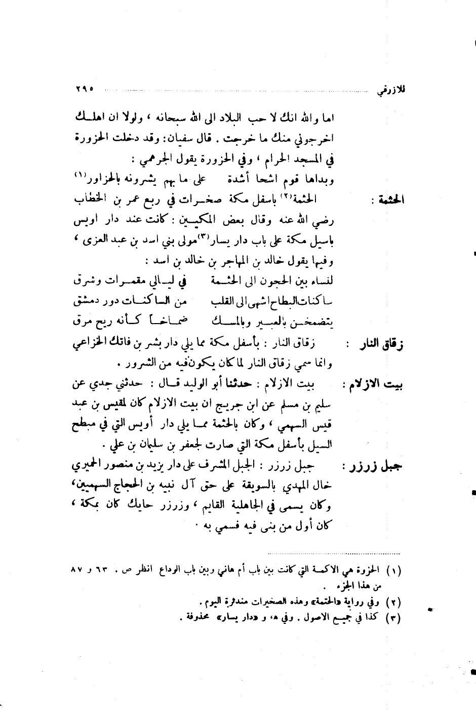 حَدَّثَنَا أَبُو الْوَلِيدِ قَالَ: حَدَّثَنِي جَدِّي، عَنْ سُلَيْمِ بْنِ مُسْلِمٍ، عَنِ ابْنِ جُرَيْجٍ أَنَّ §بَيْتَ الْأَزْلَامِ كَانَ لِمِقْيَسِ بْنِ عَبْدِ قَيْسٍ السَّهْمِيِّ، وَكَانَ بِالْحَثْمَةِ مِمَّا يَلِي دَارَ أُوَيْسٍ الَّتِي فِي مَبْطَحِ السَّيْلِ بِأَسْفَلِ مَكَّةَ الَّتِي صَارَتْ لِجَعْفَرِ بْنِ سُلَيْمَانَ بْنِ عَلِيٍّ ". جَبَلُ زَرْزَرَ: الْجَبَلُ الْمُشْرِفُ عَلَى دَارِ يَزِيدَ بْنِ مَنْصُورٍ الْحِمْيَرِيِّ خَالِ الْمَهْدِيِّ بِالسُّوَيْقَةِ، عَلَى حَقِّ آلِ نُبَيْهِ بْنِ الْحَجَّاجِ السَّهْمِيِّينَ، وَكَانَ يُسَمَّى فِي الْجَاهِلِيَّةِ الْقَائِمَ، وَزَرْزَرُ حَائِكٌ كَانَ بِمَكَّةَ، كَانَ أَوَّلَ مَنْ بَنَى فِيهِ، فَسُمِّيَ بِهِ