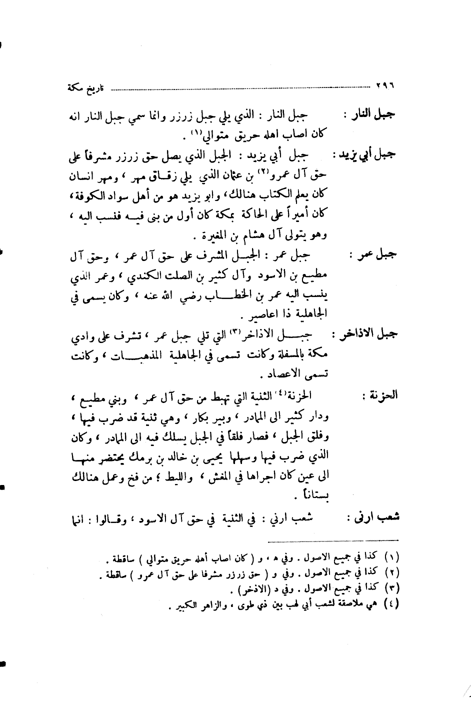 جَبَلُ النَّارِ: الَّذِي يَلِي جَبَلَ زَرْزَرَ، وَإِنَّمَا سُمِّيَ جَبَلَ النَّارِ؛ أَنَّهُ كَانَ أَصَابَ أَهْلَهُ حَرِيقٌ مُتَوَالٍ جَبَلُ أَبِي يَزِيدَ: الْجَبَلُ الَّذِي يَصِلُ حَقَّ زَرْزَرَ مُشْرِفًا عَلَى حَقِّ آلِ عَمْرِو بْنِ عُثْمَانَ الَّذِي يَلِي زُقَاقَ مُهْرٍ، وَمُهْرٌ إِنْسَانٌ كَانَ يُعَلِّمُ الْكِتَابَ هُنَالِكَ، وَأَبُو يَزِيدَ هُوَ مِنْ أَهْلِ سَوَادِ الْكُوفَةِ، كَانَ أَمِيرًا عَلَى الْحَاكَةِ بِمَكَّةَ، كَانَ أَوَّلَ مَنْ بَنَى فِيهِ، فَنُسِبَ إِلَيْهِ، وَهُوَ يَتَوَلَّى آلَ هِشَامِ بْنِ الْمُغِيرَةِ جَبَلُ عُمَرَ: الْجَبَلُ الْمُشْرِفُ عَلَى حَقِّ آلِ عُمَرَ، وَحَقِّ آلِ مُطِيعِ بْنِ الْأَسْوَدِ، وَآلِ كَثِيرِ بْنِ الصَّلْتِ الْكِنْدِيِّ، وَعُمَرُ الَّذِي يُنْسَبُ إِلَيْهِ عُمَرُ بْنُ الْخَطَّابِ رَضِيَ اللَّهُ عَنْهُ، وَكَانَ يُسَمَّى فِي الْجَاهِلِيَّةِ ذَا أَعَاصِيرَ. جَبَلُ الْأَذَاخِرِ: الَّتِي تَلِي جَبَلَ عُمَرَ، تُشْرِفُ عَلَى وَادِي مَكَّةَ بِالْمَسْفَلَةِ، وَكَانَتْ تُسَمَّى فِي الْجَاهِلِيَّةِ الْمُذْهَبَاتِ، وَكَانَتْ تُسَمَّى الْأَعْصَادَ. الْحَزْنَةُ: الثَّنِيَّةُ الَّتِي تَهْبِطُ مِنْ حَقِّ آلِ عُمَرَ، وَبَنِي مُطِيعٍ، وَدَارِ كَثِيرٍ إِلَى الْمَمَادِرِ، وَبِيرِ بَكَّارٍ، وَهِيَ ثَنِيَّةٌ قَدْ ضُرِبَ فِيهَا، وَفُلِقَ الْجَبَلُ، فَصَارَ فَلْقًا فِي الْجَبَلِ يَسْلُكُ فِيهِ إِلَى الْمَمَادِرِ، وَكَانَ الَّذِي ضَرَبَ فِيهَا وَسَهَّلَهَا يَحْيَى بْنُ خَالِدِ بْنِ بَرْمَكَ، يَحْتَضِرُ مِنْهَا إِلَى عَيْنٍ كَانَ أَجْرَاهَا فِي الْمَغَشِّ وَاللِّيطِ مِنْ فَخٍّ، وَعَمِلَ هُنَالِكَ بُسْتَانًا. شِعْبُ أَرْنَى: فِي الثَّنِيَّةِ فِي حَقِّ آلِ الْأَسْوَدِ وَقَالُوا: إِنَّمَا