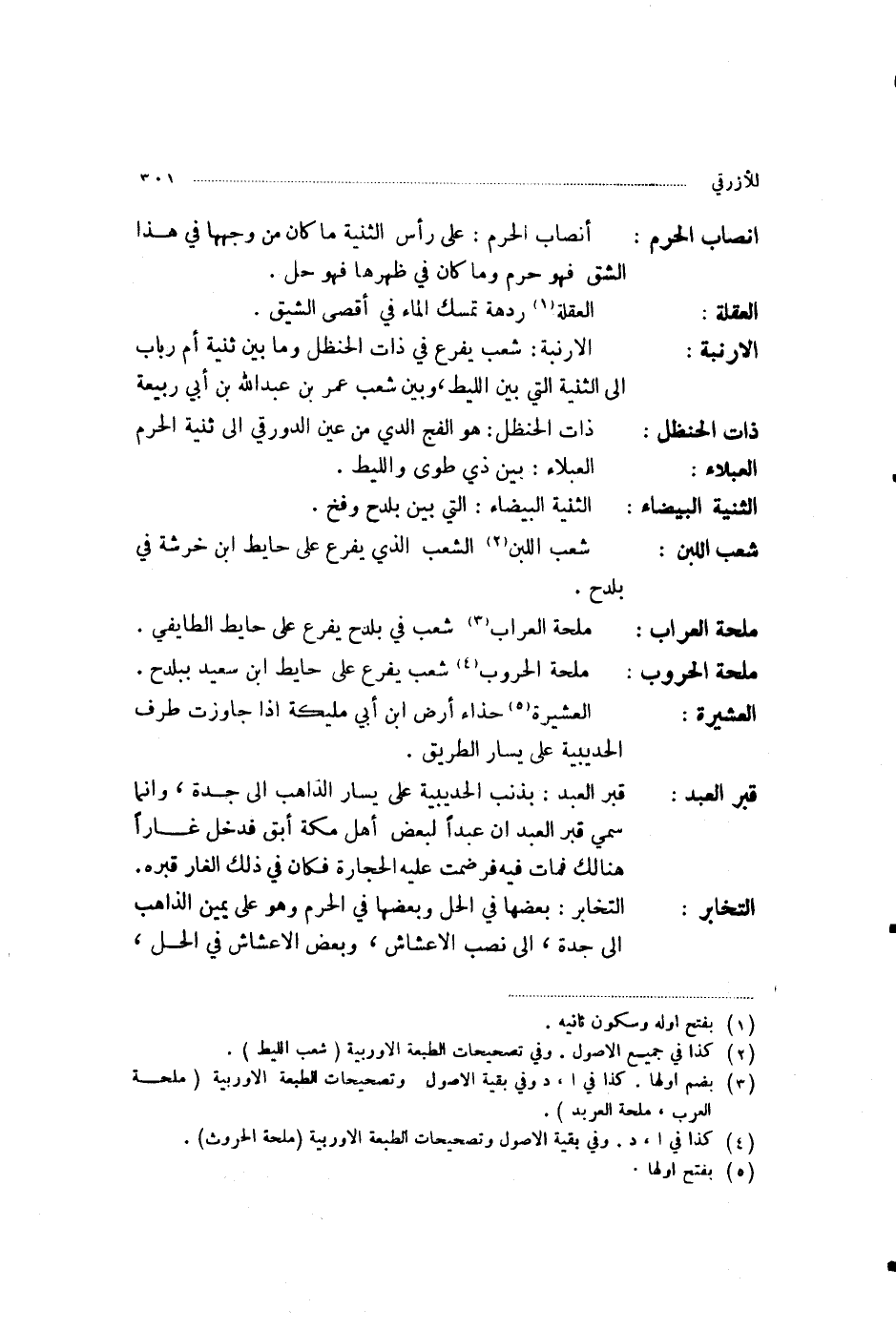، أَنْصَابُ الْحَرَمِ: عَلَى رَأْسِ الثَّنِيَّةِ مَا كَانَ مِنْ وَجْهِهَا فِي هَذَا الشِّقِّ فَهُوَ حَرَمٌ، وَمَا كَانَ فِي ظَهْرِهَا فَهُوَ حِلٌّ الْعَقْلَةُ: رَدْهَةٌ تُمْسِكُ الْمَاءَ فِي أَقْصَى الشِّيقِ، الْأَرْنَبَةُ: شِعْبٌ يَفْرَعُ فِي ذَاتِ الْحَنْظَلِ، وَمَا بَيْنَ ثَنِيَّةِ أُمِّ رَبَابٍ إِلَى الثَّنِيَّةِ الَّتِي بَيْنَ اللِّيطِ وَبَيْنَ شِعْبِ عُمَرَ بْنِ عَبْدِ اللَّهِ بْنِ أَبِي رَبِيعَةَ، ذَاتُ الْحَنْظَلِ: هُوَ الْفَجُّ الَّذِي مِنْ عَيْنِ الدَّوْرَقِيِّ إِلَى ثَنِيَّةِ الْحَرَمِ، الْعَبْلَاءُ: بَيْنَ ذِي طُوًى وَاللِّيطِ الثَّنِيَّةُ الْبَيْضَاءُ: الَّتِي بَيْنَ بَلْدَحَ وَفَخٍّ، شِعْبُ اللَّبَنِ الَّذِي يَفْرَعُ عَلَى حَائِطِ ابْنِ خَرَشَةَ فِي بَلْدَحَ، مُلْحَةُ الْعِرَابِ: شِعْبٌ فِي بَلْدَحَ يَفْرَعُ عَلَى حَائِطِ الطَّائِفِيِّ، مُلْحَةُ الْحُرُوبِ: شِعْبٌ يَفْرَعُ عَلَى حَائِطِ ابْنِ سَعِيدٍ بِبَلْدَحَ، الْعَشِيرَةُ: حِذَاءَ أَرْضِ ابْنِ أَبِي مُلَيْكَةَ إِذَا جَاوَزْتَ طَرَفَ الْحُدَيْبِيَةِ عَلَى يَسَارِ الطَّرِيقِ قَبْرُ الْعَبْدِ: بِذَنَبِ الْحُدَيْبِيَةِ عَلَى يَسَارِ الذَّاهِبِ إِلَى جُدَّةَ، وَإِنَّمَا سُمِّيَ قَبْرَ الْعَبْدِ؛ أَنَّ عَبْدًا لِبَعْضِ أَهْلِ مَكَّةَ أَبَقَ، فَدَخَلَ غَارًا هُنَالِكَ، فَمَاتَ فِيهِ، فَرَضَمَتْ عَلَيْهِ الْحِجَارَةُ، فَكَانَ فِي ذَلِكَ الْغَارِ قَبْرُهُ، التَّخَابُرُ: بَعْضُهَا فِي الْحِلِّ، وَبَعْضُهَا فِي الْحَرَمِ، وَهُوَ عَلَى يَمِينِ الذَّاهِبِ إِلَى جُدَّةَ، إِلَى نَصَبِ الْأَعْشَاشِ، وَبَعْضُ الْأَعْشَاشِ فِي الْحِلِّ