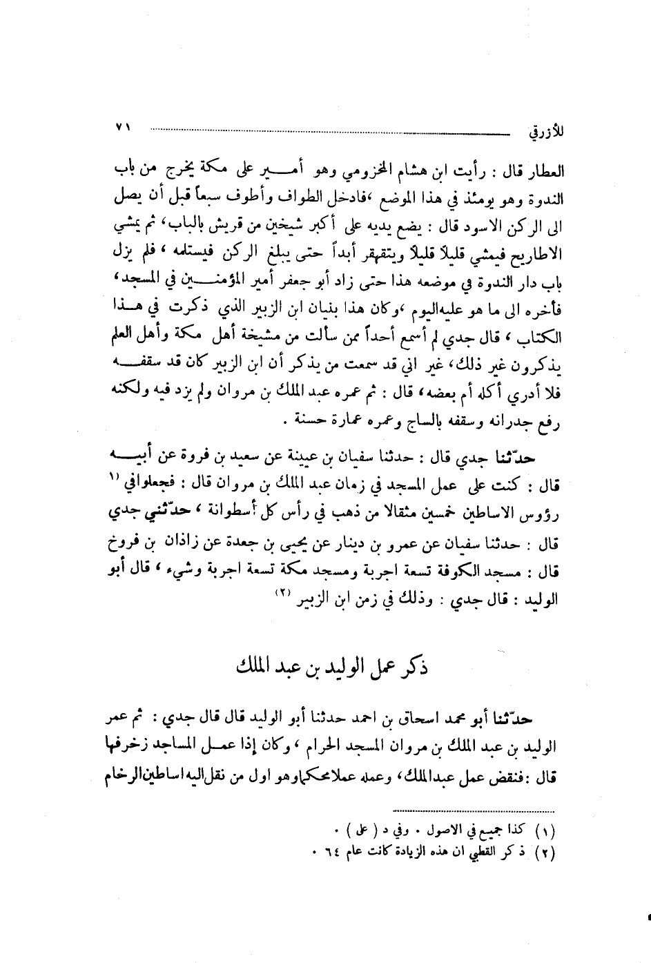 الْعَطَّارُ قَالَ: " رَأَيْتُ ابْنَ هِشَامٍ الْمَخْزُومِيَّ، وَهُوَ أَمِيرٌ عَلَى مَكَّةَ يَخْرُجُ مِنْ بَابِ النَّدْوَةِ، وَهُوَ يَوْمَئِذٍ فِي هَذَا الْمَوْضِعِ، فَأَدْخُلُ الطَّوَافَ وَأَطُوفُ سَبْعًا قَبْلَ أَنْ يَصِلَ إِلَى الرُّكْنِ الْأَسْوَدِ، قَالَ: يَضَعُ يَدَيْهِ عَلَى أَكْبَرِ شَيْخَيْنِ مِنْ قُرَيْشٍ بِالْبَابِ، ثُمَّ يَمْشِي الْأَطَارِيحَ فَيَمْشِي قَلِيلًا قَلِيلًا، وَيَتَقْهَقْرُ أَبَدًا حَتَّى يَبْلُغَ الرُّكْنَ فَيَسْتَلِمَهُ، فَلَمْ يَزَلْ بَابُ دَارِ النَّدْوَةِ فِي مَوْضِعِهِ هَذَا حَتَّى زَادَ أَبُو جَعْفَرٍ أَمِيرُ الْمُؤْمِنِينَ فِي الْمَسْجِدِ، فَأَخَّرَهُ إِلَى مَا هُوَ عَلَيْهِ الْيَوْمَ، وَكَانَ هَذَا بُنْيَانَ ابْنِ الزُّبَيْرِ الَّذِي ذَكَرْتُ فِي هَذَا الْكِتَابِ "، قَالَ جَدِّي: لَمْ أَسْمَعْ أَحَدًا مِمَّنْ سَأَلْتُ مِنْ مَشْيَخَةِ أَهْلِ مَكَّةَ، وَأَهْلِ الْعِلْمِ يَذْكُرُونَ غَيْرَ ذَلِكَ، غَيْرَ أَنِّي قَدْ سَمِعْتُ مَنَ يَذْكُرُ أَنَّ ابْنَ الزُّبَيْرِ كَانَ قَدْ سَقَفَهُ، فَلَا أَدْرِي أَكُلَّهُ أَمْ بَعْضَهُ؟ قَالَ: «ثُمَّ عَمَّرَهُ عَبْدُ الْمَلِكِ بْنُ مَرْوَانَ وَلَمْ يَزِدْ فِيهِ، وَلَكِنَّهُ رَفَعَ جُدْرَانَهُ وَسَقْفَهُ بِالسَّاجِ، وَعَمَّرَهُ عِمَارَةً حَسَنَةً»