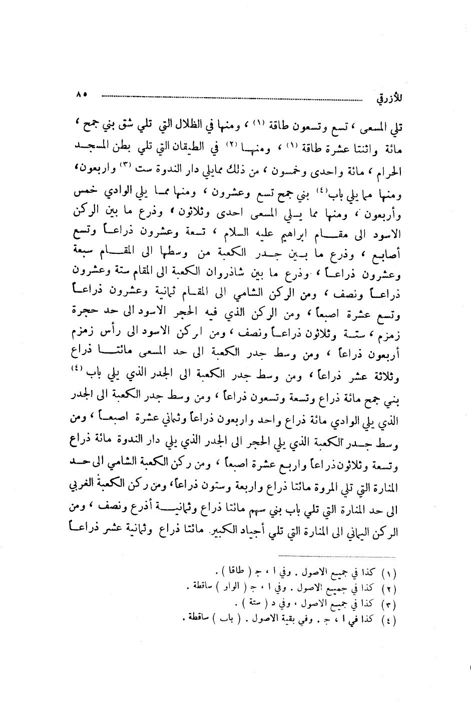 تَلِي الْمَسْعَى تِسْعٌ وَتِسْعُونَ طَاقَةً، وَمِنْهَا فِي الظِّلَالِ الَّتِي تَلِي شِقَّ بَنِي جُمَحٍ مِائَةٌ وَاثْنَتَا عَشْرَةَ طَاقَةً، وَمِنْهَا فِي الطِّيقَانِ الَّتِي تَلِي بَطْنَ الْمَسْجِدِ الْحَرَامِ مِائَةٌ وَإِحْدَى وَخَمْسُونَ، مِنْ ذَلِكَ مِمَّا يَلِي دَارَ النَّدْوَةِ سِتٌّ وَأَرْبَعُونَ، وَمِنْهَا مِمَّا يَلِي بَابَ بَنِي جُمَحٍ تِسْعٌ وَعِشْرُونَ، وَمِنْهَا مِمَّا يَلِي الْوَادِيَ خَمْسٌ وَأَرْبَعُونَ، وَمِنْهَا مِمَّا يَلِي الْمَسْعَى إِحْدَى وَثَلَاثُونَ، وَذَرْعُ مَا بَيْنَ الرُّكْنِ الْأَسْوَدِ إِلَى مَقَامِ إِبْرَاهِيمَ عَلَيْهِ السَّلَامُ، تِسْعَةٌ وَعِشْرُونَ ذِرَاعًا وَتِسْعُ أَصَابِعَ، وَذَرْعُ مَا بَيْنَ جَدْرِ الْكَعْبَةِ مِنْ وَسَطِهَا إِلَى الْمَقَامِ سَبْعَةٌ وَعِشْرُونَ ذِرَاعًا، وَذَرْعُ مَا بَيْنَ شَاذَرْوَانِ الْكَعْبَةِ إِلَى الْمَقَامِ سِتَّةٌ وَعِشْرُونَ ذِرَاعًا وَنِصْفٌ، وَمِنَ الرُّكْنِ الشَّامِيِّ إِلَى الْمَقَامِ ثَمَانِيَةٌ وَعِشْرُونَ ذِرَاعًا وَتِسْعَةَ عَشَرَة إِصْبَعًا، وَمِنِ الرُّكْنِ الَّذِي فِيهِ الْحَجَرُ الْأَسْوَدُ إِلَى حَدِّ حُجْرَةِ زَمْزَمَ، سِتَّةٌ وَثَلَاثُونَ ذِرَاعًا وَنِصْفٌ، وَمِنَ الرُّكْنِ الْأَسْوَدِ إِلَى رَأْسِ زَمْزَمَ أَرْبَعُونَ ذِرَاعًا، وَمِنْ وَسَطِ جَدْرِ الْكَعْبَةِ إِلَى حَدِّ الْمَسْعَى مِائَتَا ذِرَاعٍ، وَثَلَاثَةَ عَشَرَ ذِرَاعًا، وَمِنْ وَسَطِ جَدْرِ الْكَعْبَةِ إِلَى الْجَدْرِ الَّذِي يَلِي بَابَ بَنِي جُمَحٍ مِائَةُ ذِرَاعٍ وَتِسْعَةٌ وَتِسْعُونَ ذِرَاعًا، وَمِنْ وَسَطِ جَدْرِ الْكَعْبَةِ إِلَى الْجَدْرِ الَّذِي يَلِي الْوَادِيَ مِائَةُ ذِرَاعٍ وَإِحْدَى وَأَرْبَعُونَ ذِرَاعًا وَثَمَانِيَةَ عَشَرَ إِصْبَعًا، وَمِنْ وَسَطِ جَدْرِ الْكَعْبَةِ الَّذِي يَلِي الْحَجَرَ إِلَى الْجَدْرِ الَّذِي يَلِي دَارَ النَّدْوَةِ مِائَةُ ذِرَاعٍ وَتِسْعَةٌ وَثَلَاثُونَ ذِرَاعًا وَأَرْبَعَةَ عَشَرَ إِصْبَعًا، وَمِنْ رُكْنِ الْكَعْبَةِ الشَّامِيِّ إِلَى حَدِّ الْمَنَارَةِ الَّتِي تَلِي الْمَرْوَةَ مِائَتَا ذِرَاعٍ وَأَرْبَعَةٌ وَسِتُّونَ ذِرَاعًا، وَمِنْ رُكْنِ الْكَعْبَةِ الْغَرْبِيِّ إِلَى حَدِّ الْمَنَارَةِ الَّتِي تَلِي بَابَ بَنِي سَهْمٍ مِائَتَا ذِرَاعٍ وَثَمَانِيَةُ أَذْرُعٍ وَنِصْفٌ، وَمِنَ الرُّكْنِ الْيَمَانِي إِلَى الْمَنَارَةِ الَّتِي تَلِي أَجْيَادًا الْكَبِيرَ مِائَتَا ذِرَاعٍ وَثَمَانِيَةَ عَشَرَ ذِرَاعًا