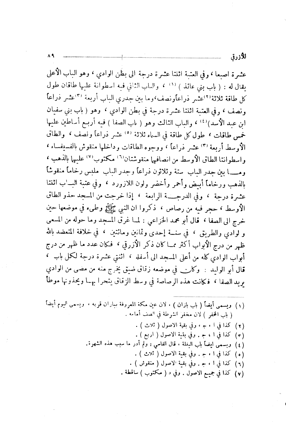 عَشَرَ إِصْبَعًا، وَفِي الْعَتَبَةِ اثْنَتَا عَشْرَةَ دَرَجَةً إِلَى بَطْنِ الْوَادِي، وَهُوَ الْبَابُ الْأَعْلَى، يُقَالُ لَهُ: بَابُ بَنِي عَائِذٍ، وَالْبَابُ الثَّانِي فِيهِ أُسْطُوَانَةٌ عَلَيْهَا طَاقَانِ طُولُ كُلِّ طَاقٍ ثَلَاثَةَ عَشَرَ ذِرَاعًا وَنِصْفٌ، وَمَا بَيْنَ جَدْرَيِ الْبَابِ أَرْبَعَةَ عَشَرَ ذِرَاعًا وَنِصْفٌ، وَفِي الْعَتَبَةِ اثْنَتَا عَشْرَةَ دَرَجَةً فِي بَطْنِ الْوَادِي، وَهُوَ بَابُ بَنِي سُفْيَانَ بْنِ عَبْدِ الْأَسَدِ، وَالْبَابُ الثَّالِثُ، وَهُوَ بَابُ الصَّفَا فِيهِ أَرْبَعُ أَسَاطِينَ عَلَيْهَا خَمْسُ طَاقَاتٍ طُولُ كُلِّ طَاقَةٍ فِي السَّمَاءِ ثَلَاثَةَ عَشَرَ ذِرَاعًا وَنِصْفٌ، وَالطَّاقُ الْأَوْسَطُ أَرْبَعَةَ عَشَرَ ذِرَاعًا، وَوُجُوهُ الطَّاقَاتِ وَدَاخِلُهَا مَنْقُوشٌ بِالْفُسَيْفِسَاءِ، وَأُسْطُوَانَتَا الطَّاقِ الْأَوْسَطِ مِنْ أَنْصَافِهِمَا مَنْقُوشَتَانِ مَكْتُوبٌ عَلَيْهِمَا بِالذَّهَبِ، وَمَا بَيْنَ جَدْرِ الْبَابِ سِتَّةٌ وَثَلَاثُونَ ذِرَاعًا، وَجَدْرُ الْبَابِ مُلَبَّسٌ رُخَامًا مَنْقُوشٌ بِالذَّهَبِ، وَرُخَامًا أَبْيَضَ وَأَحْمَرَ وَأَخْضَرَ، وَلَوْنَ اللَّازَوَرْدِ، وَفِي عَتَبَةِ الْبَابِ اثْنَتَا عَشْرَةَ دَرَجَةً، وَفِي الدَّرَجَةِ الرَّابِعَةِ، إِذَا خَرَجْتَ مِنَ الْمَسْجِدِ حَذْوَ الطَّاقِ الْأَوْسَطِ، حَجَرٌ فِيهِ مِنْ رَصَاصٍ، ذَكَرُوا أَنَّ النَّبِيَّ ـ صَلَّى اللهُ عَلَيْهِ وَسَلَّمَ ـ وَطِئَ فِي مَوْضِعَهَا حِينَ خَرَجَ إِلَى الصَّفَا " قَالَ أَبُو مُحَمَّدٍ الْخُزَاعِيُّ: لَمَّا غَرِقَ الْمَسْجِدُ وَمَا حَوْلَهُ مِنَ الْمَسْعَى وَالْوَادِي وَالطَّرِيقُ، فِي سَنَةِ إِحْدَى وَثَمَانِينَ وَمِائَتَيْنِ فِي خِلَافَةِ الْمُعْتَضِّدِ بِاللَّهِ ظَهَرَ مِنْ دَرْجِ الْأَبْوَابِ أَكْثَرُ مِمَّا كَانَ ذَكَرَ الْأَزْرَقِيُّ، فَكَانَ عَدَدُ مَا ظَهَرَ مِنْ دَرْجِ أَبْوَابِ الْوَادِي كُلِّهِ مِنْ أَعْلَى الْمَسْجِدِ إِلَى أَسْفَلِهِ، اثْنَتَيْ عَشْرَةَ دَرَجَةً لِكُلِّ بَابٍ قَالَ أَبُو الْوَلِيدِ: وَكَانَ فِي مَوْضِعِهِ زُقَاقٌ ضَيِّقٌ يَخْرُجُ مِنْهُ مَنْ مَضَى مِنَ الْوَادِي يُرِيدُ الصَّفَا، فَكَانَتْ هَذِهِ الرَّصَاصَةُ فِي وَسَطِ الزُّقَاقِ يُتَحَرَّى بَهَا وَيَحْذُونَهَا مَوْطِأَ