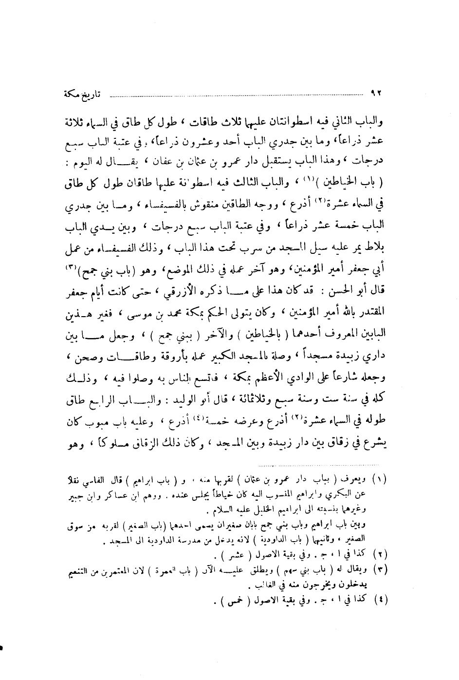 ، وَالْبَابُ الثَّانِي فِيهِ أُسْطُوَانَتَانِ عَلَيْهِمَا ثَلَاثُ طَاقَاتٍ طُولُ كُلِّ طَاقٍ فِي السَّمَاءِ ثَلَاثَةَ عَشَرَ ذِرَاعًا، وَمَا بَيْنَ جَدْرَيِ الْبَابِ إِحْدَى وَعِشْرُونَ ذِرَاعًا، وَفِي عَتَبَةِ الْبَابِ سَبْعُ دَرَجَاتٍ، وَهَذَا الْبَابُ يَسْتَقْبِلُ دَارَ عَمْرِو بْنِ عُثْمَانَ بْنِ عَفَّانَ، يُقَالُ لَهُ الْيَوْمَ: بَابُ الْخَيَّاطِينَ، وَالْبَابُ الثَّالِثُ فِيهِ أُسْطُوَانَةٌ عَلَيْهَا طَاقَانِ طُولُ كُلِّ طَاقٍ فِي السَّمَاءِ عَشَرُةُ أَذْرُعٍ، وَوَجْهُ الطَّاقَيْنِ مَنْقُوشٌ بِالْفُسَيْفِسَاءِ، وَمَا بَيْنَ جَدْرَيِ الْبَابِ خَمْسَةَ عَشَرَ ذِرَاعًا وَفِي عَتَبَةِ الْبَابِ سَبْعُ دَرَجَاتٍ وَبَيْنَ يَدَيِ الْبَابِ بَلَاطٌ يَمُرُّ عَلَيْهِ سَيْلُ الْمَسْجِدِ مِنْ سَرْبٍ تَحْتَ هَذَا الْبَابِ، وَذَلِكَ الْفُسَيْفِسَاءُ مِنْ عَمَلِ أَبِي جَعْفَرٍ أَمِيرِ الْمُؤْمِنِينِ، وَهُوَ آخِرُ عَمَلِهِ فِي ذَلِكَ الْمَوْضِعِ، وَهُوَ بَابُ بَنِي جُمَحٍ قَالَ أَبُو الْحَسَنِ: قَدْ كَانَ هَذَا عَلَى مَا ذَكَرَهُ الْأَزْرَقِيُّ، حَتَّى كَانَتْ أَيَّامُ جَعْفَرٍ الْمُقْتَدِرَ بِاللَّهِ أَمِيرِ الْمُؤْمِنِينِ، وَكَانَ يَتَوَلَّى الْحُكْمَ بِمَكَّةَ مُحَمَّدُ بْنُ مُوسَى، فَغَيَّرَ هَذَيْنِ الْبَابَيْنِ: الْمَعْرُوفُ أَحَدُهُمَا بِالْخَيَّاطِينَ، وَالْآخَرُ بِبَنِي جُمَحٍ، وَجَعَلَ مَا بَيْنَ دَارَيْ زُبَيْدَةَ مَسْجِدًا، وَصِلَةً بِالْمَسْجِدِ الْكَبِيرِ عَمِلَهُ بِأَرْوِقَةٍ وَطَاقَاتٍ وَصَحْنٍ، وَجَعَلَهُ شَارِعًا عَلَى الْوَادِي الْأَعْظَمِ بِمَكَّةَ، فَاتَّسَعَ بِالنَّاسِ وَصَلُّوا فِيهِ، وَذَلِكَ كُلُّهُ فِي سَنَةِ سِتٍّ وَسَنَةِ سَبْعٍ وَثَلَاثِمَائِةٍ قَالَ أَبُو الْوَلِيدِ: وَالْبَابُ الرَّابِعُ طَاقٌ طُولُهُ فِي السَّمَاءِ عَشَرَةُ أَذْرُعٍ، وَعَرْضُهُ خَمْسَةُ أَذْرُعٍ، وَعَلَيْهِ بَابٌ مُبَوَّبٌ كَانَ يَشْرَعُ فِي زُقَاقٍ بَيْنَ دَارِ زُبَيْدَةَ وَبَيْنَ الْمَسْجِدِ، وَكَانَ ذَلِكَ الزُّقَاقُ مَسْلُوكًا، وَهُوَ