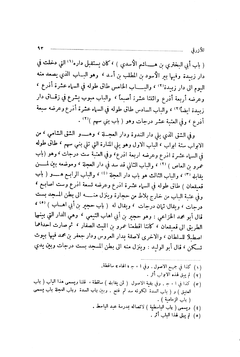 بَابُ أَبِي الْبَخْتَرِيِّ بْنِ هَاشِمٍ الْأَسَدِيِّ، كَانَ يَسْتَقْبِلُ دَارَهُ الَّتِي دَخَلَتْ فِي دَارِ زُبَيْدَةَ، وَفِيهَا بِئْرُ الْأَسْوَدِ بْنِ الْمُطَّلِبِ بْنِ أَسَدٍ، وَهُوَ الْبَابُ الَّذِي يُصْعَدُ مِنْهُ الْيَوْمَ إِلَى دَارِ زُبَيْدَةَ، وَالْبَابُ الْخَامِسُ طَاقٌ طُولُهُ فِي السَّمَاءِ عَشَرَةُ أَذْرُعٍ، وَعَرْضُهُ أَرْبَعَةُ أَذْرُعٍ، وَاثْنَا عَشَرَ إِصْبَعًا، وَالْبَابُ مُبَوَّبٌ يَشْرَعُ فِي زُقَاقِ دَارِ زُبَيْدَةَ أَيْضًا، وَالْبَابُ السَّادِسُ طَاقٌ طُولُهُ فِي السَّمَاءِ عَشَرَةُ أَذْرُعٍ وَعَرْضُهُ سَبْعَةُ أَذْرُعٍ، وَفِي الْعَتَبَةِ عَشْرُ دَرَجَاتٍ، وَهُوَ بَابُ بَنِي سَهْمٍ وَفِي الشِّقِّ الَّذِي يَلِي دَارَ النَّدْوَةِ وَدَارَ الْعَجَلَةِ، وَهُوَ الشِّقُّ الشَّامِيُّ مِنَ الْأَبْوَابِ سِتَّةُ أَبْوَابٍ، الْبَابُ الْأَوَّلُ وَهُوَ يَلِي الْمَنَارَةَ الَّتِي تَلِي بَنِي سَهْمٍ، طَاقٌ طُولُهُ، فِي السَّمَاءِ عَشَرَةُ أَذْرُعٍ، وَعَرْضُهُ أَرْبَعَةُ أَذْرُعٍ، وَفِي الْعَتَبَةِ سِتُّ دَرَجَاتٍ، وَهُوَ بَابُ عَمْرِو بْنِ الْعَاصِ، وَالْبَابُ الثَّانِي قَدْ سُدَّ فِي دَارِ الْعَجَلَةِ، وَمَوْضِعُهُ بَيِّنٌ لِمَنْ يُقَابِلُهُ، وَالْبَابُ الثَّالِثُ هُوَ بَابُ دَارِ الْعَجَلَةِ، وَالْبَابُ الرَّابِعُ، هُوَ بَابُ قُعَيْقِعَانَ طَاقٌ طُولُهُ فِي السَّمَاءِ عَشَرَةُ أَذْرُعِ وَعَرْضُهُ تِسْعَةُ أَذْرُعٍ وَسِتَّةُ أَصَابِعَ، وَفِي عَتَبَةِ الْبَابِ مِنْ خَارِجٍ بَلَاطٌ مِنْ حِجَارَةٍ، وَيُنْزَلُ مِنْهُ إِلَى بَطْنِ الْمَسْجِدِ بِسِتِّ دَرَجَاتٍ، وَيُقَالُ ثَمَانُ دَرَجَاتٍ، وَيُقَالُ لَهُ بَابُ حُجَيْرِ بْنِ أَبِي إِهَابَ قَالَ أَبُو مُحَمَّدٍ الْخُزَاعِيُّ: وَهُوَ حُجَيْرُ بْنُ أَبِي إِهَابَ التَّيْمِيُّ، وَهِيَ الدَّارُ الَّتِي بَيْنَهُمَا الطَّرِيقُ إِلَى قُعَيْقِعَانَ، كَانَتْ أُقْطِعَتَا عَمْرُو بْنُ اللَّيْثِ الصَّفَّارُ، ثُمَّ صَارَتْ إِحْدَاهُمَا اصْطَبْلًا لِلسُّلْطَانِ، وَالْأُخْرَى لَاصِقَةً بِدَارِ الْعَرُوسِ وَدَارِ جَعْفَرِ بْنِ مُحَمَّدٍ فِيهَا بُيُوتٌ تُسْكَنُ قَالَ أَبُو الْوَلِيدِ: وَيُنْزَلُ مِنْهُ إِلَى بَطْنِ الْمَسْجِدِ بِسِتِّ دَرَجَاتٍ، وَبَيْنَ يَدَيِ