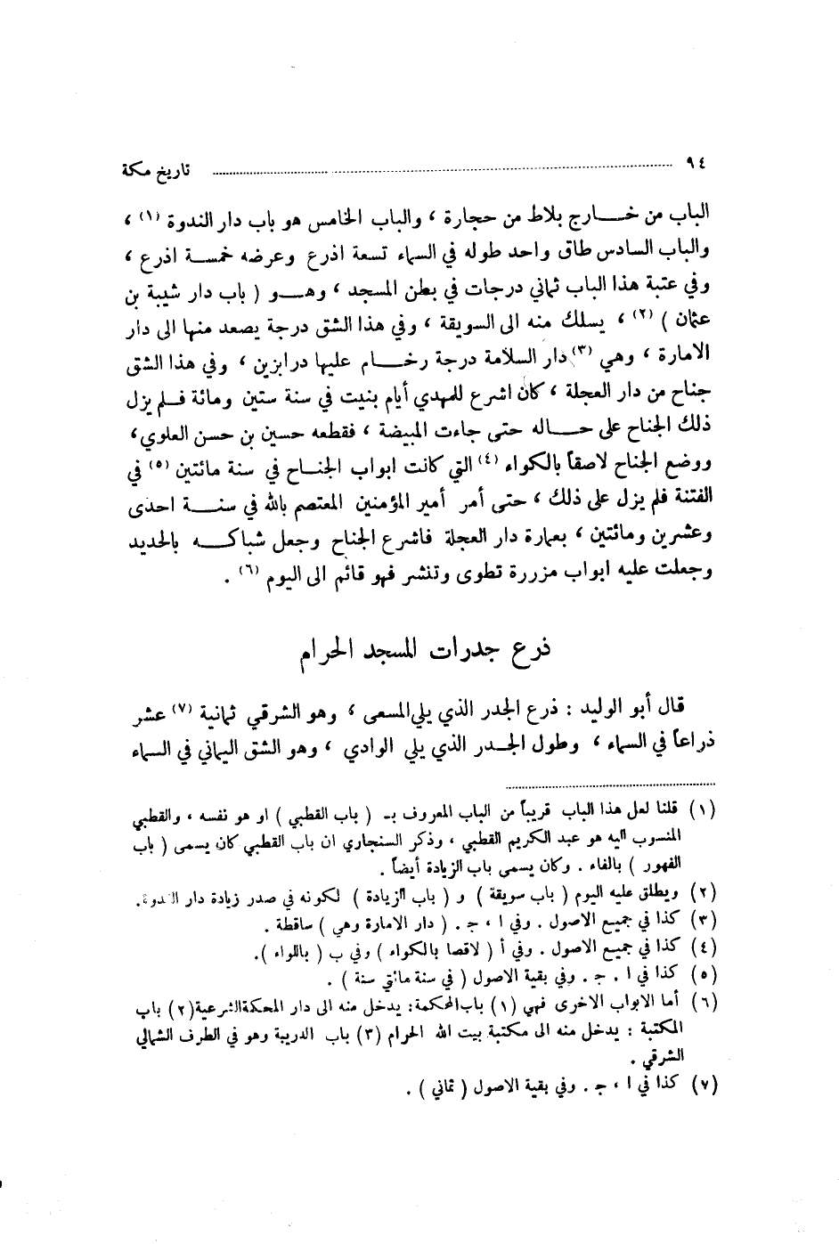 الْبَابِ مِنْ خَارِجٍ بَلَاطٌ مِنْ حِجَارَةٍ، وَالْبَابُ الْخَامِسُ هُوَ بَابُ دَارِ النَّدْوَةِ، وَالْبَابُ السَّادِسُ طَاقٌ وَاحِدٌ طُولُهُ فِي السَّمَاءِ تِسْعَةُ أَذْرُعٍ، وَعَرْضُهُ خَمْسَةُ أَذْرُعٍ، وَفِي عَتَبَةِ هَذَا الْبَابِ ثَمَانِ دَرَجَاتٍ فِي بَطْنِ الْمَسْجِدِ، وَهُوَ بَابُ دَارِ شَيْبَةَ بْنِ عُثْمَانَ، يُسْلَكُ مِنْهُ إِلَى السُّوَيْقَةِ، وَفِي هَذَا الشِّقِّ دَرَجَةٌ يُصْعَدُ مِنْهَا إِلَى دَارِ الْإِمَارَةِ، وَهِيَ دَارُ السَّلَامَةِ، دَرَجَةُ رُخَامٍ عَلَيْهَا دَرَابْزِينَ، وَفِي هَذَا الشِّقِّ جَنَاحٌ مِنْ دَارِ الْعَجَلَةِ، كَانَ أَشْرَعَ لِلْمَهْدِيِّ أَيَّامَ بُنِيَتْ فِي سَنَةِ سِتِّينَ وَمِائَةٍ، فَلَمْ يَزَلْ ذَلِكَ الْجَنَاحُ عَلَى حَالِهِ حَتَّى جَاءَتِ الْمُبَيَّضَةُ، فَقَطَعَهُ حُسَيْنُ بْنُ حَسَنٍ الْعَلَوِيُّ، وَوَضَعَ الْجَنَاحَ لَاصِقًا بِالْكَوَّاءِ الَّتِي كَانَتْ أَبْوَابُ الْجَنَاحِ فِي سَنَةِ مِائَتَيْنِ فِي الْفِتْنَةِ فَلَمْ يَزَلْ عَلَى ذَلِكَ، حَتَّى أَمَرَ أَمِيرُ الْمُؤْمِنِينَ الْمُعْتَصِمُ بِاللَّهِ فِي سَنَةِ إِحْدَى وَعِشْرِينَ وَمِائَتَيْنِ بِعِمَارَةِ دَارِ الْعَجَلَةِ، فَأَشْرَعَ الْجَنَاحَ، وَجَعَلَ شُبَّاكَهُ بِالْحَدِيدِ، وَجُعِلَتْ عَلَيْهِ أَبْوَابٌ مُزَرَّرَةٌ تُطْوَى وَتُنْشَرُ فَهُوَ قَائِمٌ إِلَى الْيَوْمِ