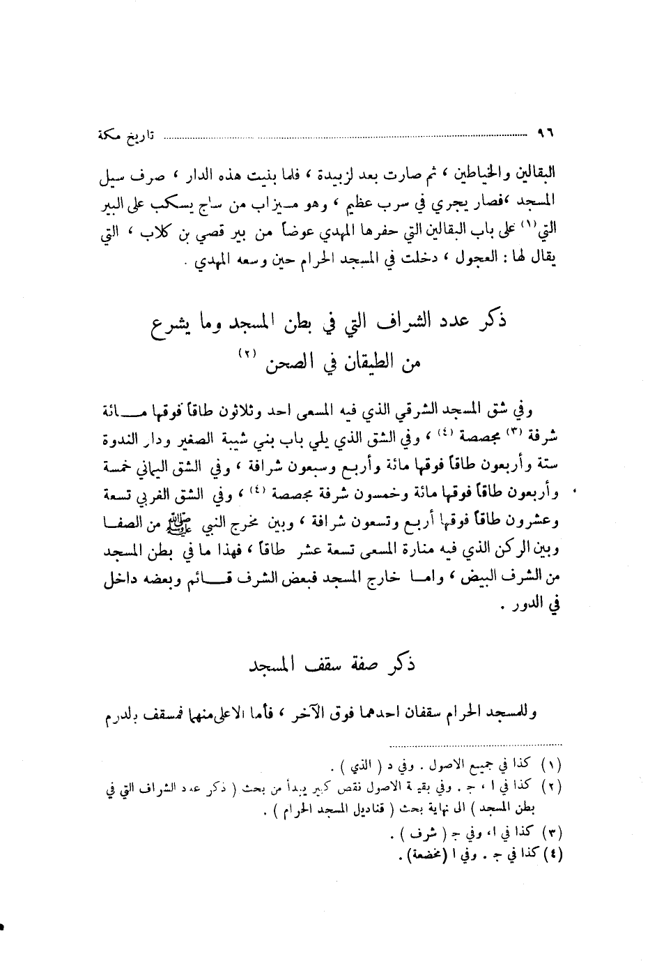 §ذِكْرُ عَدَدِ الشُّرَفِ الَّتِي فِي بَطْنِ الْمَسْجِدِ وَمَا يُشْرَعُ مِنَ الطِّيقَانِ فِي الصَّحْنِ وَفِي شِقِّ الْمَسْجِدِ الَّذِي فِيهِ الْمَسْعَى إِحْدَى وَثَلَاثُونَ طَاقٍا فَوْقَهَا مِائَةُ شُرْفَةٍ مُجَصَّصَةٍ، وَفِي الشِّقِّ الَّذِي يَلِي بَابَ بَنِي شَيْبَةَ الصَّغِيرَ وَدَارَ النَّدْوَةِ سِتَّةٌ وَأَرْبَعُونَ طَاقًا فَوْقَهَا مِائَةٌ وَأَرْبَعٌ وَسَبْعُونَ شُرَّافَةً، وَفِي الشِّقِّ الْيَمَانِي خَمْسَةٌ وَأَرْبَعُونَ طَاقًا فَوْقَهَا مِائَةٌ وَخَمْسُونَ شُرْفَةً مُجَصَّصَةً، وَفِي الشِّقِّ الْغَرْبِيِّ تِسْعَةٌ وَعِشْرُونَ طَاقًا فَوْقَهَا أَرْبَعٌ وَتِسْعُونَ شُرَّافَةً، وَبَيْنَ مَخْرَجِ النَّبِيِّ ـ صَلَّى اللهُ عَلَيْهِ وَسَلَّمَ ـ مِنَ الصَّفَا وَبَيْنَ الرُّكْنِ الَّذِي فِيهِ مَنَارَةُ الْمَسْعَى تِسْعَةَ عَشَرَ طَاقًا، فَهَذَا مَا فِي بَطْنِ الْمَسْجِدِ مِنَ الشُّرَفِ الْبِيضِ، وَأَمَّا خَارِجُ الْمَسْجِدِ فَبَعْضُ الشُّرَفِ قَائِمٌ، وَبَعْضُهُ دَاخِلٌ فِي الدُّورِ