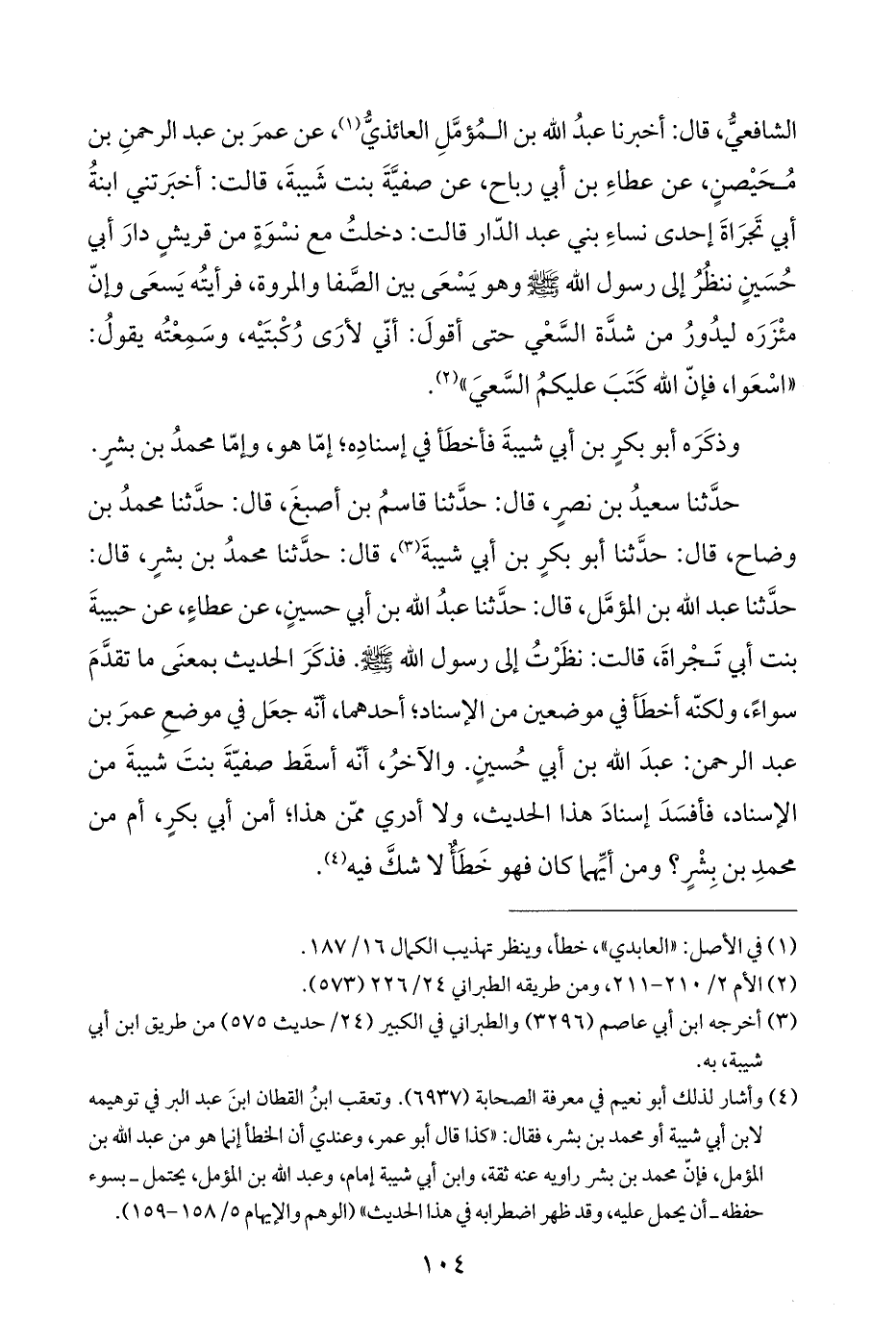 حدَّثنا سعيدُ بن نصرٍ، قال: حدَّثنا قاسمُ بن أصبغَ، قال: حدَّثنا محمدُ بن وضاح، قال: حدَّثنا أبو بكرٍ بن أبي شيبةَ (¬٣)، قال: حدَّثنا محمدُ بن بشرٍ، قال: حدَّثنا عبد الله بن المؤمَّل، قال: حدَّثنا عبدُ الله بن أبي حسينٍ، عن عطاءٍ، عن حبيبةَ بنت أبي تَجْراةَ، قالت: نظَرْتُ إلى رسول الله - صلى الله عليه وسلم -. فذكَرَ الحديث بمعنَى ما تقدَّمَ سواءً، ولكنّه أخطَأ في موضعين من الإسناد؛ أحدهما، أنّه جعَل في موضعِ عمرَ بن عبد الرحمن: عبدَ الله بن أبي حُسينٍ. والآخرُ، أنّه أسقَط صفيّةَ بنتَ شيبةَ من الإسناد، فأفسَدَ إسنادَ هذا الحديث، ولا أدري ممّن هذا؛ أمن أبي بكرٍ، أم من محمدِ بن بِشْرٍ؟ ومن أيِّهما كان فهو خَطَأٌ لا شكَّ فيه (¬٤).