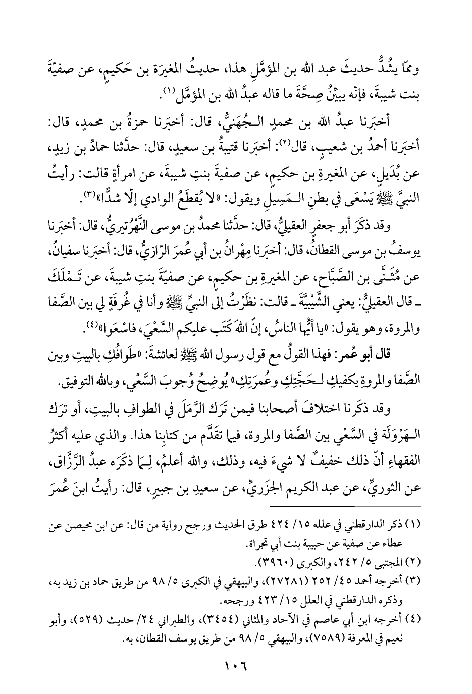 أخبَرنا عبدُ الله بن محمدٍ الجُهَنيُّ، قال: أخبَرنا حمزةُ بن محمدٍ، قال: أخبَرنا أحمدُ بن شعيبٍ، قال (¬٢): أخبَرنا قتيبةُ بن سعيدٍ، قال: حدَّثنا حمادُ بن زيدٍ، عن بُدَيلٍ، عن المغيرةِ بن حكيمٍ، عن صفيةَ بنتِ شيبةَ، عن امرأةٍ قالت: رأيتُ النبيَّ - صلى الله عليه وسلم - يَسْعَى في بطنِ المَسِيلِ ويقول: "لا يُقطَعُ الوادي إلّا شدًّا" (¬٣).