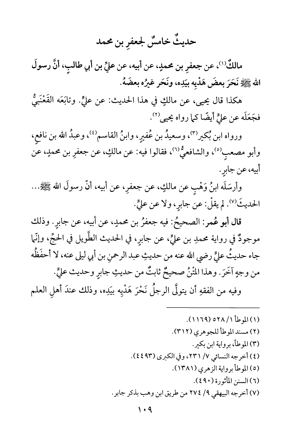 مالكٌ (¬١)، عن جعفرِ بن محمدٍ، عن أبيه، عن عليِّ بن أبي طالبٍ، أنَّ رسولَ الله - صلى الله عليه وسلم - نَحَرَ بعضَ هَدْيِه بيَدِه، ونَحَر غيرُه بعضَهُ.