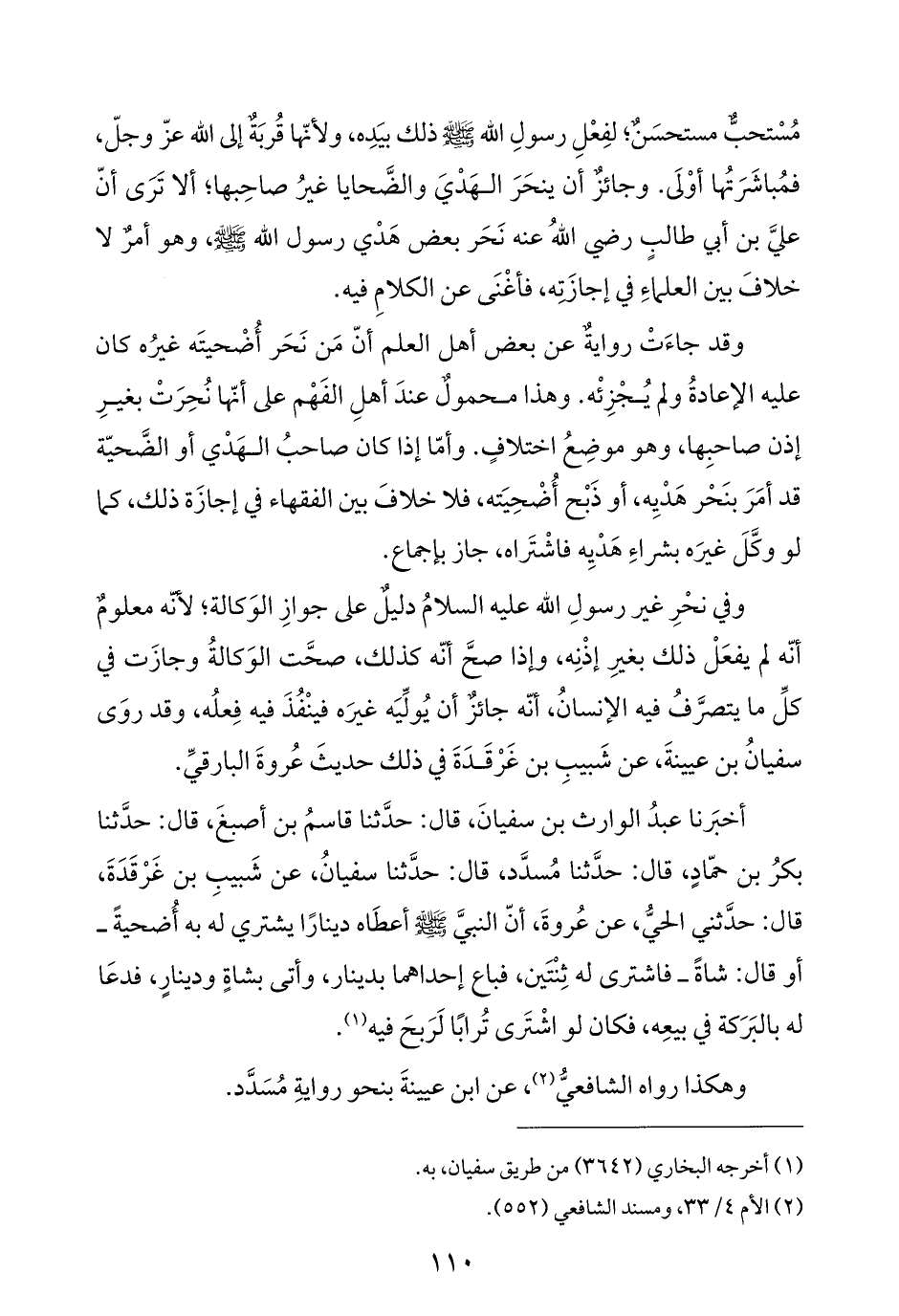 أخبَرنا عبدُ الوارث بن سفيانَ، قال: حدَّثنا قاسمُ بن أصبغَ، قال: حدَّثنا بكرُ بن حمّادٍ، قال: حدَّثنا مُسدَّد، قال: حدَّثنا سفيانُ، عن شَبيبِ بن غَرْقَدةَ، قال: حدَّثني الحيُّ، عن عُروةَ، أنّ النبيَّ - صلى الله عليه وسلم - أعطَاه دينارًا يشتري له به أُضحيةً - أو قال: شاةً - فاشترى له ثِنْتَين، فباع إحداهما بدينار، وأتى بشاةٍ ودينارٍ، فدعَا له بالبَرَكة في بيعِه، فكان لو اشْتَرى تُرابًا لَرَبحَ فيه (¬١).