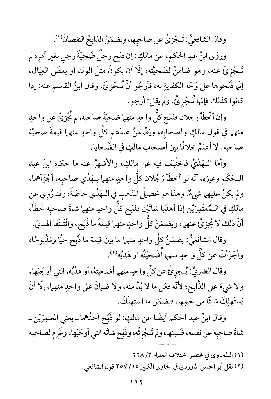 وقال الشافعيُّ: يضمَنُ كلُّ واحدٍ منهما ما بينَ قيمة ما ذَبَح حيًّا ومَذْبوحًا، وأجْزَأتْ عن كلِّ واحدٍ منهما أُضْحيَتُه أو هَدْيُه (¬٢).
