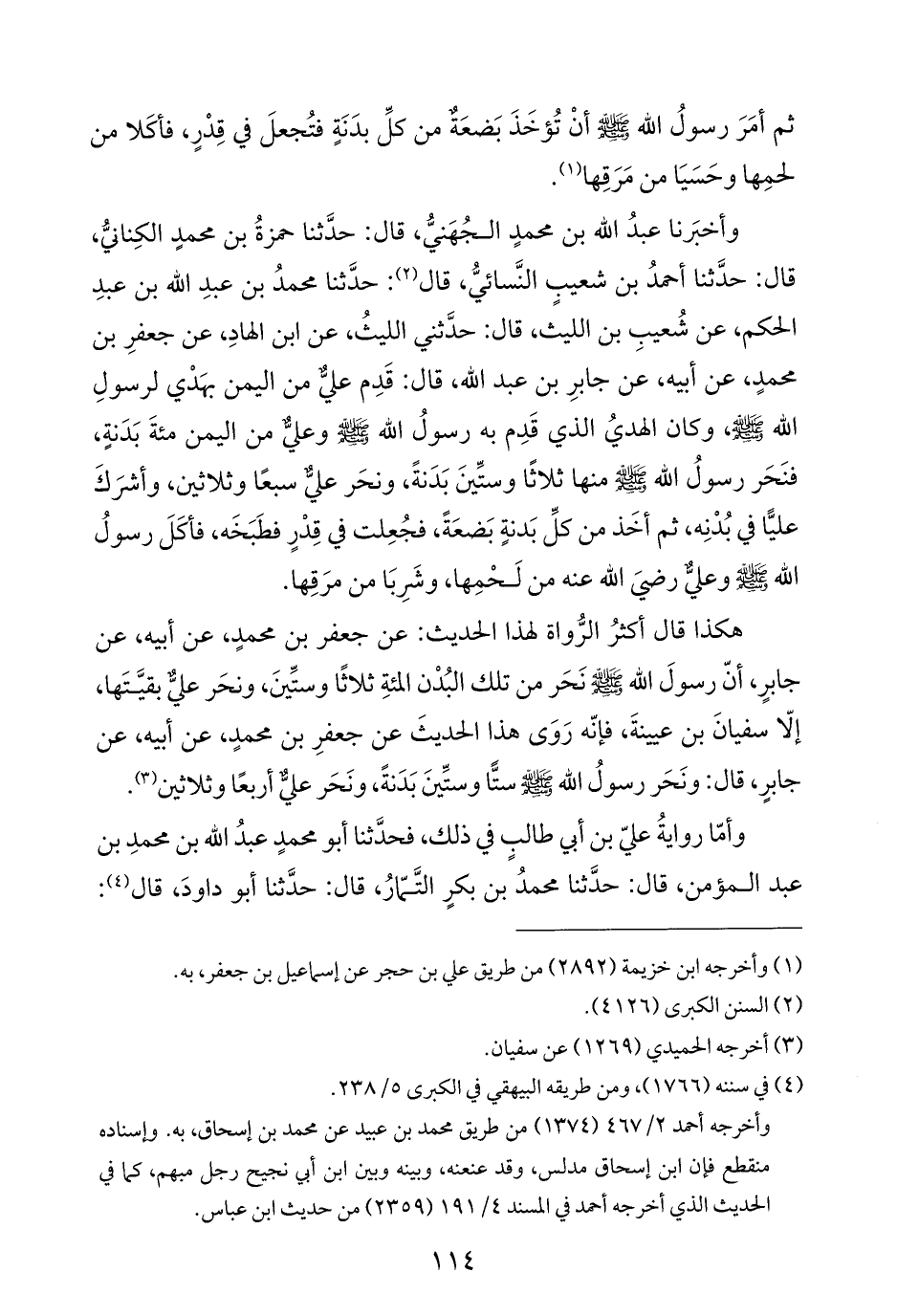 وأخبَرنا عبدُ الله بن محمدٍ الجُهَنيُّ، قال: حدَّثنا حمزةُ بن محمدٍ الكِنانيُّ، قال: حدَّثنا أحمدُ بن شعيبٍ النَّسائيُّ، قال (¬٢): حدَّثنا محمدُ بن عبدِ الله بن عبدِ الحكم، عن شُعيبِ بن الليث، قال: حدَّثني الليثُ، عن ابن الهادِ، عن جعفرِ بن محمدٍ، عن أبيه، عن جابرِ بن عبد الله، قال: قَدِم عليٌّ من اليمن بهَدْي لرسولِ الله - صلى الله عليه وسلم -، وكان الهديُ الذي قَدِم به رسولُ الله - صلى الله عليه وسلم - وعليٌّ من اليمن مئةَ بَدَنةٍ، فنَحَر رسولُ الله - صلى الله عليه وسلم - منها ثلاثًا وستِّينَ بَدَنةً، ونحَر عليٌّ سبعًا وثلاثين، وأشرَكَ عليًّا في بُدْنِه، ثم أخَذ من كلِّ بَدنةٍ بَضعَةً، فجُعِلت في قِدْرٍ فطَبَخَه، فأكَلَ رسولُ الله - صلى الله عليه وسلم - وعليٌّ رضيَ الله عنه من لَحْمِها، وشَرِبَا من مرَقِها.