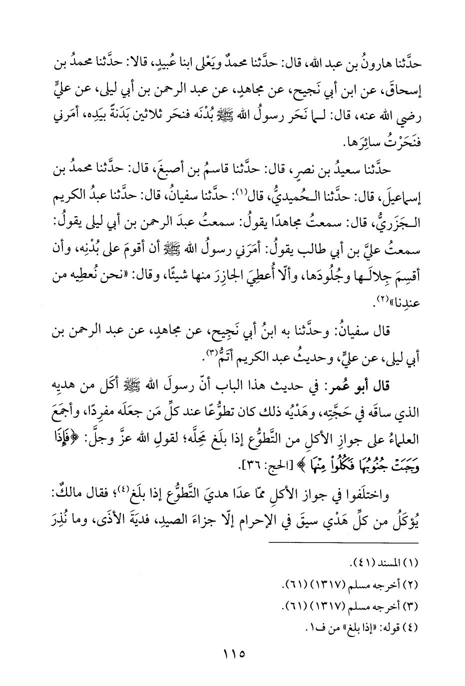 حدَّثنا هارونُ بن عبد الله، قال: حدَّثنا محمدٌ ويَعْلى ابنا عُبيدٍ، قالا: حدَّثنا محمدُ بن إسحاقَ، عن ابن أبي نَجيح، عن مجاهدٍ، عن عبد الرحمن بن أبي ليلى، عن عليٍّ رضي الله عنه، قال: لما نَحَر رسولُ الله - صلى الله عليه وسلم - بُدْنَه فنحَر ثلاثين بَدَنةً بيَدِه، أمَرني فنَحَرْتُ سائِرَها.
