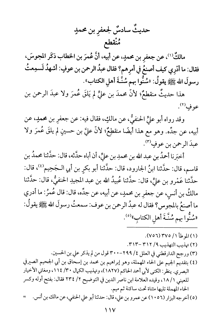 مالكٌ (¬١)، عن جعفرِ بن محمدٍ، عن أبيه، أنَّ عُمرَ بن الخطاب ذكَر المجوسَ، فقال: ما أدْرِي كيف أصنعُ في أمرِهم؟ فقال عبدُ الرحمن بن عوفٍ: أشهدُ لَسمِعتُ رسولَ الله - صلى الله عليه وسلم - يقولُ: "سُنُّوا بهم سُنَّةَ أهلِ الكتاب".