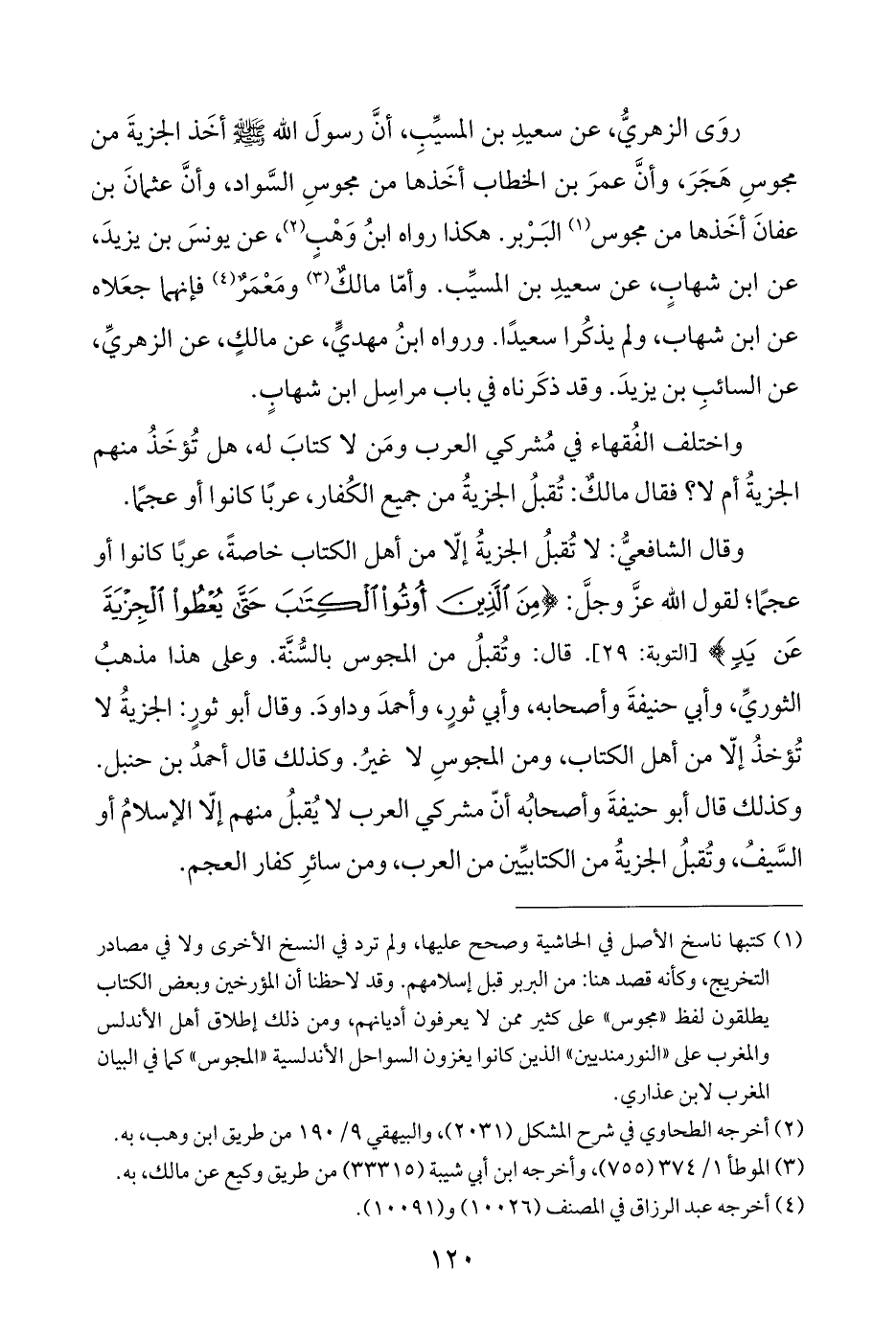 روَى الزهريُّ، عن سعيدِ بن المسيِّبِ، أنَّ رسولَ الله - صلى الله عليه وسلم - أخَذ الجزيةَ من مجوسِ هَجَرَ، وأنَّ عمرَ بن الخطاب أخَذها من مجوسِ السَّواد، وأنَّ عثمانَ بن عفانَ أخَذها من مجوس (¬١) البَرْبر. هكذا رواه ابنُ وَهْبٍ (¬٢)، عن يونسَ بن يزيدَ، عن ابن شهابٍ، عن سعيدِ بن المسيِّب. وأمّا مالكٌ (¬٣) ومَعْمَرٌ (¬٤) فإنهما جعَلاه عن ابن شهاب، ولم يذكُرا سعيدًا. ورواه ابنُ مهديٍّ، عن مالكٍ، عن الزهريِّ، عن السائبِ بن يزيدَ. وقد ذكَرناه في باب مراسِل ابن شهابٍ.