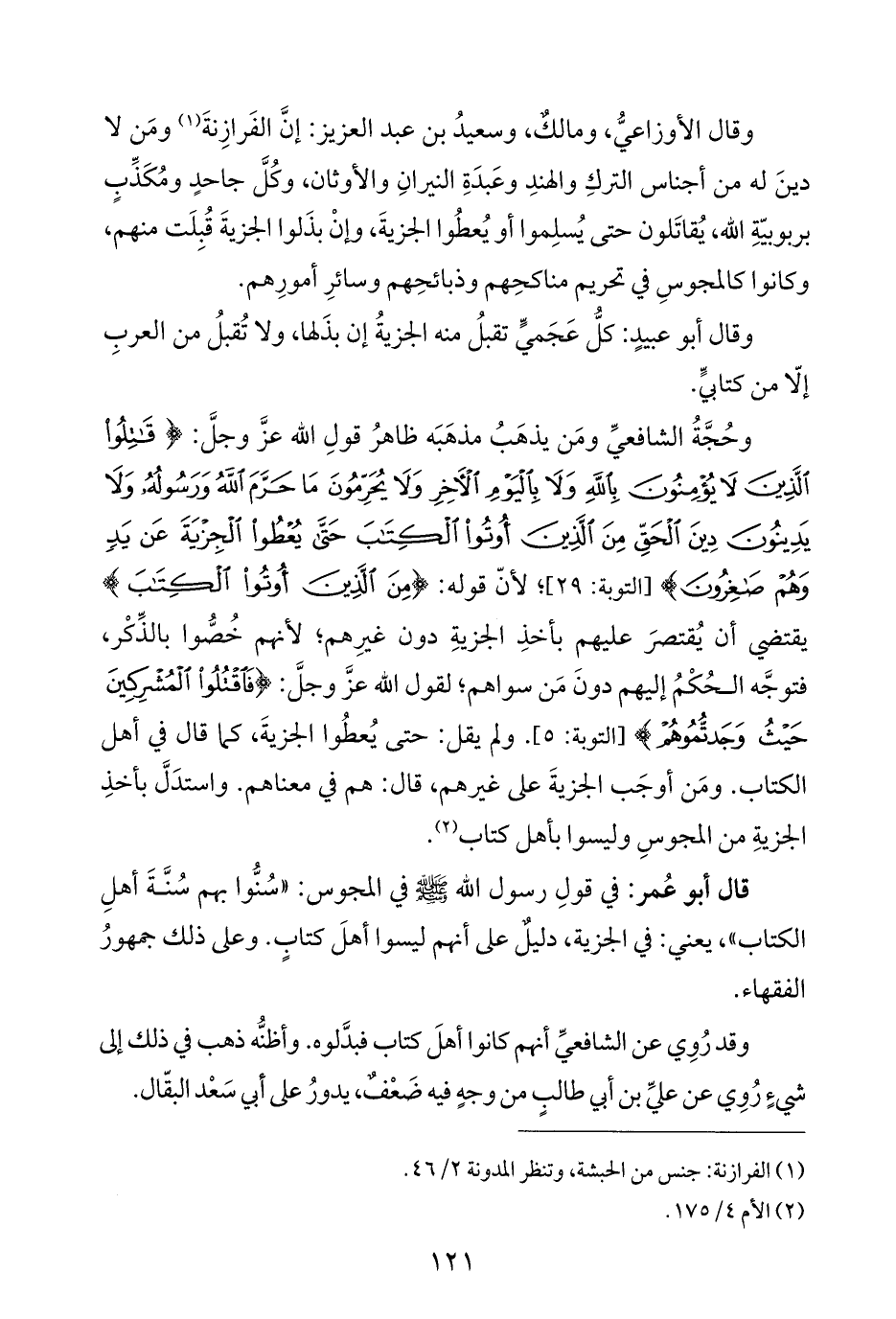 وقال أبو عبيدٍ: كلُّ عَجَميٍّ تقبلُ منه الجزيةُ إن بذَلها، ولا تُقبلُ من العربِ إلا من كتابيٍّ.