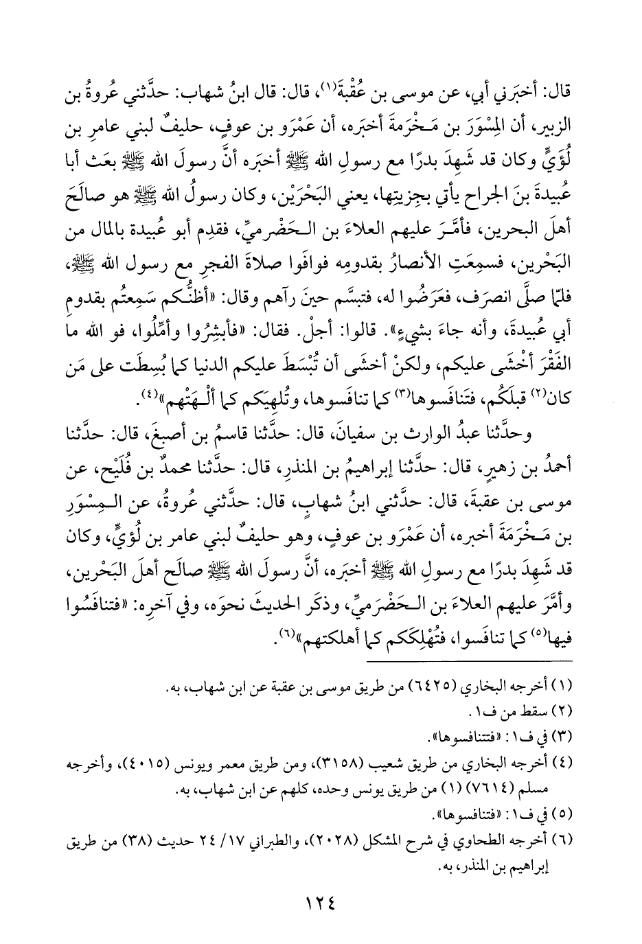 وحدَّثنا عبدُ الوارث بن سفيانَ، قال: حدَّثنا قاسمُ بن أصبغَ، قال: حدَّثنا أحمدُ بن زهيرٍ، قال: حدَّثنا إبراهيمُ بن المنذرِ، قال: حدَّثنا محمد بن فُلَيْح، عن موسى بن عقبةَ، قال: حدَّثني ابنُ شهابٍ، قال: حدَّثني عُروةُ، عن المِسْوَرِ بن مَخْرَمَةَ أخبره، أن عَمْرَو بن عوفٍ، وهو حليفٌ لبني عامر بن لُؤيٍّ، وكان قد شَهِدَ بدرًا مع رسولِ الله - صلى الله عليه وسلم - أخبَره، أنَّ رسولَ الله - صلى الله عليه وسلم - صالَح أهلَ البَحْرين، وأمَّرَ عليهم العلاءَ بن الحَضْرَميِّ، وذكَر الحديثَ نحوَه، وفي آخرِه: "فتنافَسُوا فيها (¬٥) كما تنافَسوا، فتُهْلِكَكم كما أهلكتهم" (¬٦).