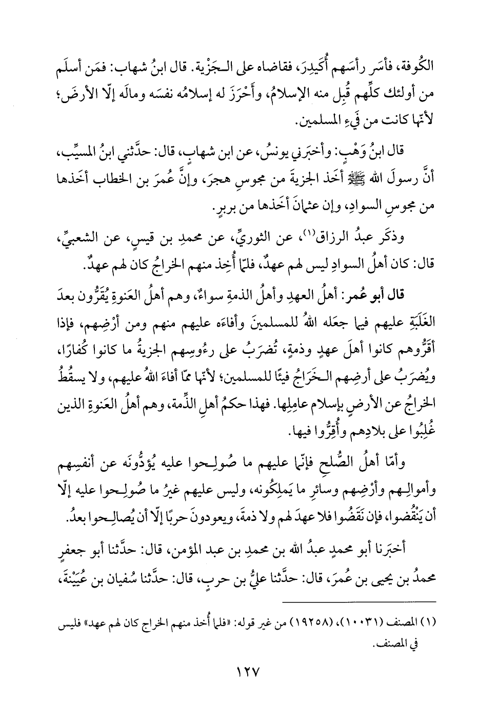 وذكَر عبدُ الرزاق (¬١)، عن الثوريِّ، عن محمدِ بن قيسٍ، عن الشعبيِّ، قال: كان أهلُ السوادِ ليس لهم عهدٌ، فلمّا أُخِذ منهم الخراجُ كان لهم عهدٌ.