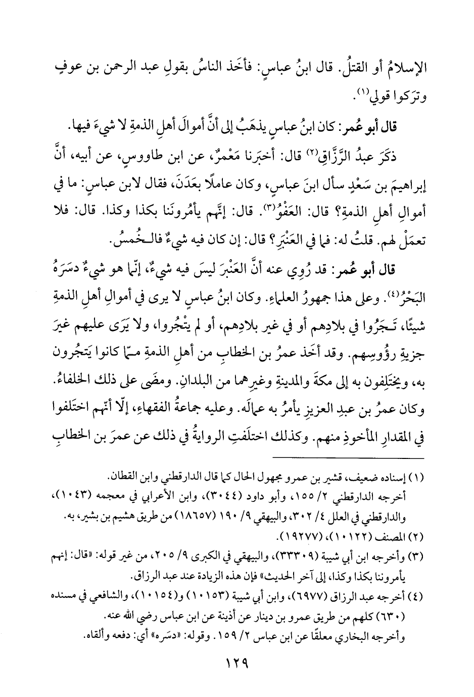 قال أبو عُمر: كان ابنُ عباسٍ يذهَبُ إلى أنَّ أموالَ أهلِ الذمةِ لا شيءَ فيها.