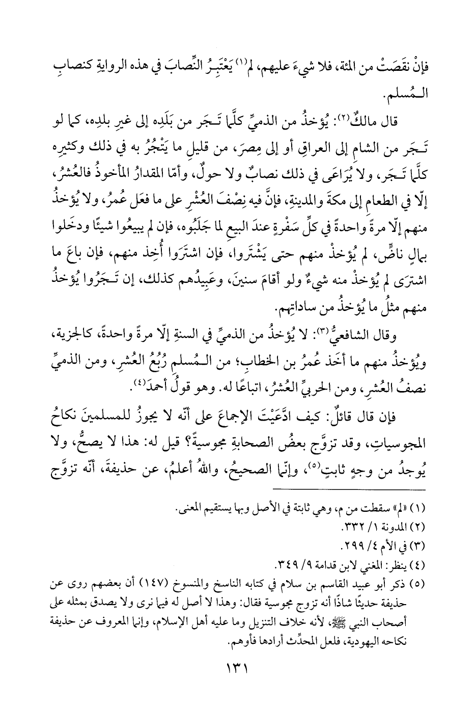 (¬٥) ذكر أبو عبيد القاسم بن سلام في كتابه الناسخ والمنسوخ (١٤٧) أن بعضهم روى عن حذيفة حديثًا شاذًّا أنه تزوج مجوسية فقال: وهذا لا أصل له فيما نرى ولا يصدق بمثله على أصحاب النبي - صلى الله عليه وسلم -، لأنه خلاف التنزيل وما عليه أهل الإسلام، وإنما المعروف عن حذيفة نكاحه اليهودية، فلعل المحدِّث أرادها فأوهم.