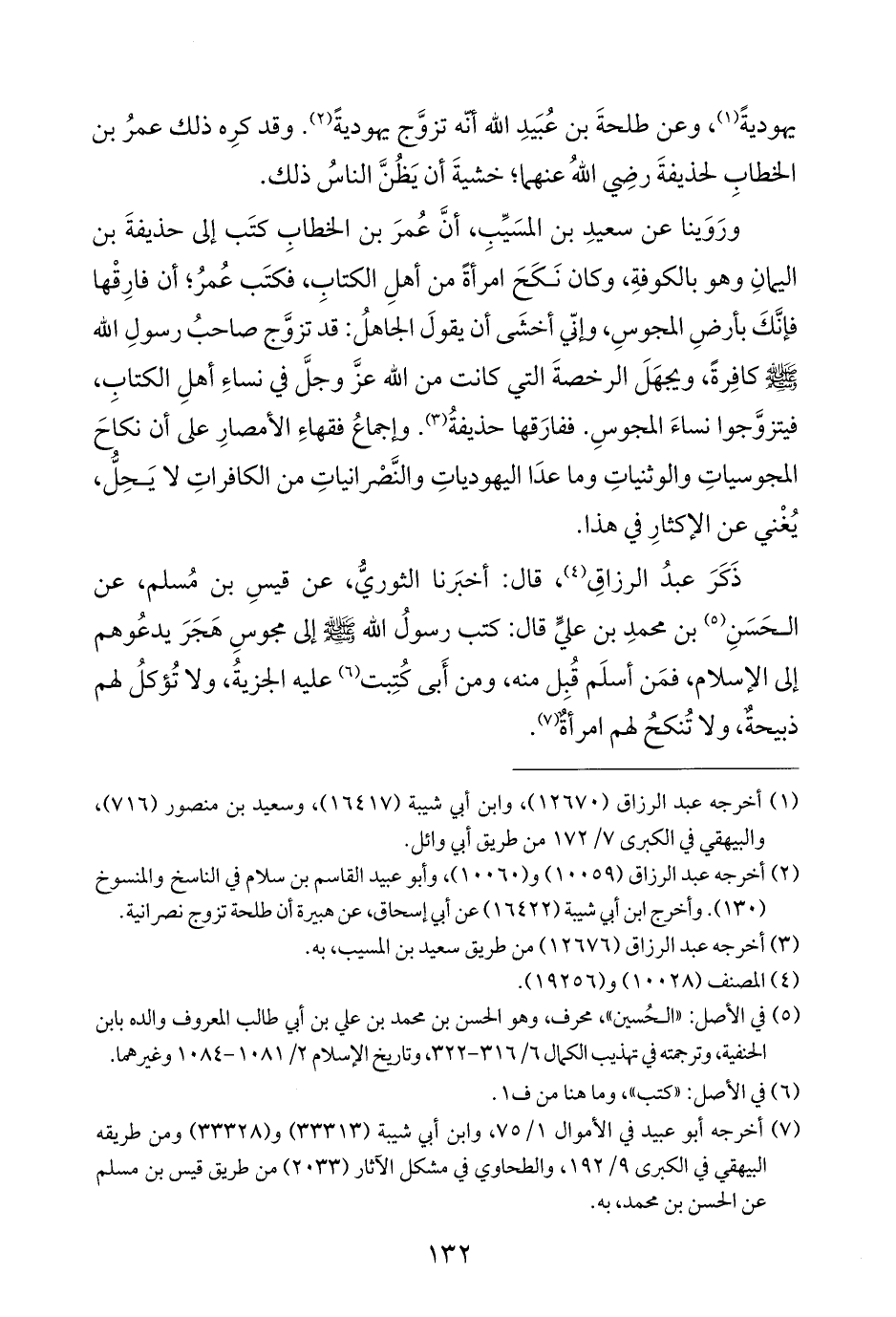 (¬٢) أخرجه عبد الرزاق (١٠٠٥٩) و (١٠٠٦٠)، وأبو عبيد القاسم بن سلام في الناسخ والمنسوخ (١٣٠). وأخرج ابن أبي شيبة (١٦٤٢٢) عن أبي إسحاق، عن هبيرة أن طلحة تزوج نصرانية.