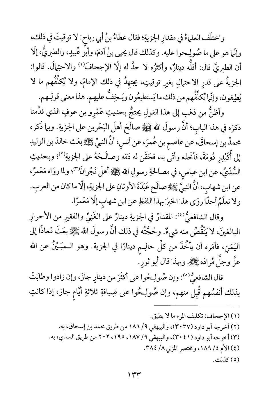 واختلَف العلماءُ في مقدارِ الجزية؛ فقال عطاءُ بنُ أبي رباحٍ: لا توقيتَ في ذلك، وإنّما هو على ما صُولِحوا عليه. وكذلك قال يحيى بنُ آدمَ، وأبو عُبيدٍ، والطبريُّ، إلّا أن الطبريَّ قال: أقلُّه دينارٌ، وأكثرُه لا حدَّ له إلّا الإجحافَ (¬١) والاحتِمالَ. قالوا: الجزيةُ على قدرِ الاحتمالِ بغيرِ توقيتٍ، يجتهِدُ في ذلك الإمامُ، ولا يُكلِّفُهم ما لا يُطِيقون، وإنّما يُكلِّفُهم من ذلك ما يَستطيعُون ويَخِفُّ عليهم. هذا معنى قولِهم.