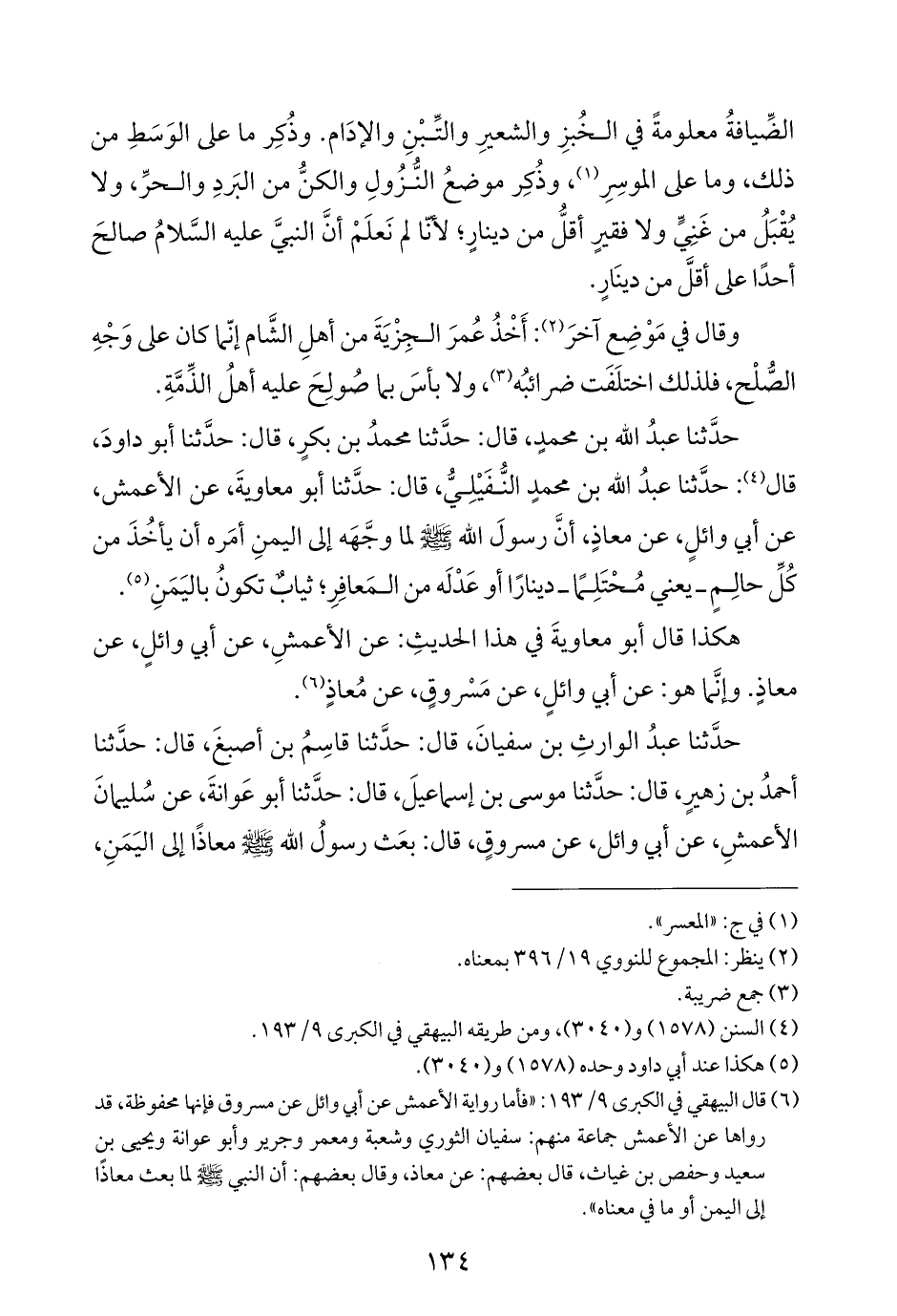 حدَّثنا عبدُ الله بن محمدٍ، قال: حدَّثنا محمدُ بن بكرٍ، قال: حدَّثنا أبو داودَ، قال (¬٤): حدَّثنا عبدُ الله بن محمدٍ النُّفَيْلِيُّ، قال: حدَّثنا أبو معاويةَ، عن الأعمش، عن أبي وائلٍ، عن معاذٍ، أنَّ رسولَ الله - صلى الله عليه وسلم - لما وجَّهَه إلى اليمنِ أمَره أن يأخُذَ من كُلِّ حالِمٍ - يعني مُحْتَلِمًا - دينارًا أو عَدْلَه من المَعافِرِ؛ ثيابٌ تكونُ باليَمَنِ (¬٥).