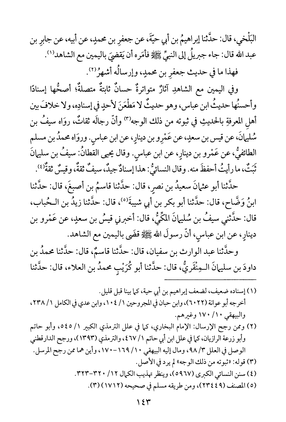 وفي اليمين مع الشاهدِ آثارٌ متواترةٌ حسانٌ ثابتةٌ متصلةٌ، أصحُّها إسنادًا وأحسنُها حديثُ ابن عباس، وهو حديث لا مَطْعَنَ لأحدٍ في إسنادِه، ولا خلافَ بين أهلِ المعرفةِ بالحديثِ في ثبوته من ذلك الوجه (¬٣) وأنّ رجالَه ثقاتٌ، روَاه سيفُ بن سُليمانَ، عن قيس بن سعدٍ، عن عَمْرِو بن دينارٍ، عن ابن عباسٍ. وروَاه محمدُ بن مسلم الطائفيُّ، عن عَمْرو بن دينارٍ، عن ابن عباسٍ. وقال يحيى القطانُ: سيفُ بن سليمانَ ثَبَتٌ، ما رأيتُ أحفظَ منه. وقال النسائيُّ: هذا إسنادٌ جيدٌ، سيفٌ ثقةٌ، وقيسٌ ثقةٌ (¬٤).