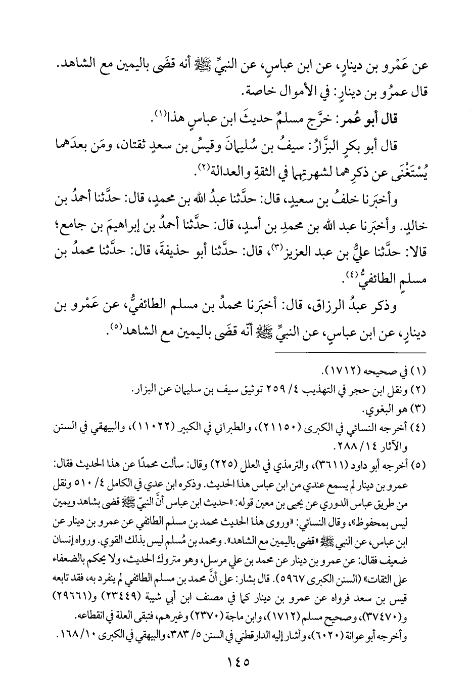 (¬٥) أخرجه أبو داود (٣٦١١)، والترمذي في العلل (٢٢٥) وقال: سألت محمدًا عن هذا الحديث فقال: عمرو بن دينار لم يسمع عندي من ابن عباس هذا الحديث. وذكره ابن عدي في الكامل ٤/ ٥١٠ ونقل من طريق عباس الدوري عن يحيى بن معين قوله: "حديث ابن عباس أنَّ النبيّ - صلى الله عليه وسلم - قضى بشاهد ويمين ليس بمحفوظ"، وقال النسائي: "وروى هذا الحديث محمد بن مسلم الطائفي عن عمرو بن دينار عن ابن عباس، عن النبي - صلى الله عليه وسلم - "قضى باليمين مع الشاهد". ومحمد بن مُسلم ليس بذلك القوي. ورواه إنسان ضعيف فقال: عن عمرو بن دينار عن محمد بن علي مرسل، وهو متروك الحديث، ولا يحكم بالضعفاء على الثقات" (السنن الكبرى ٥٩٦٧). قال بشار: على أنَّ محمد بن مسلم الطائفي لم ينفرد به، فقد تابعه قيس بن سعد فرواه عن عمرو بن دينار كما في مصنف ابن أبي شيبة (٢٣٤٤٩) و (٢٩٦٦١) و (٣٧٤٧٠)، وصحيح مسلم (١٧١٢)، وابن ماجة (٢٣٧٠) وغيرهم، فتبقى العلة في انقطاعه.