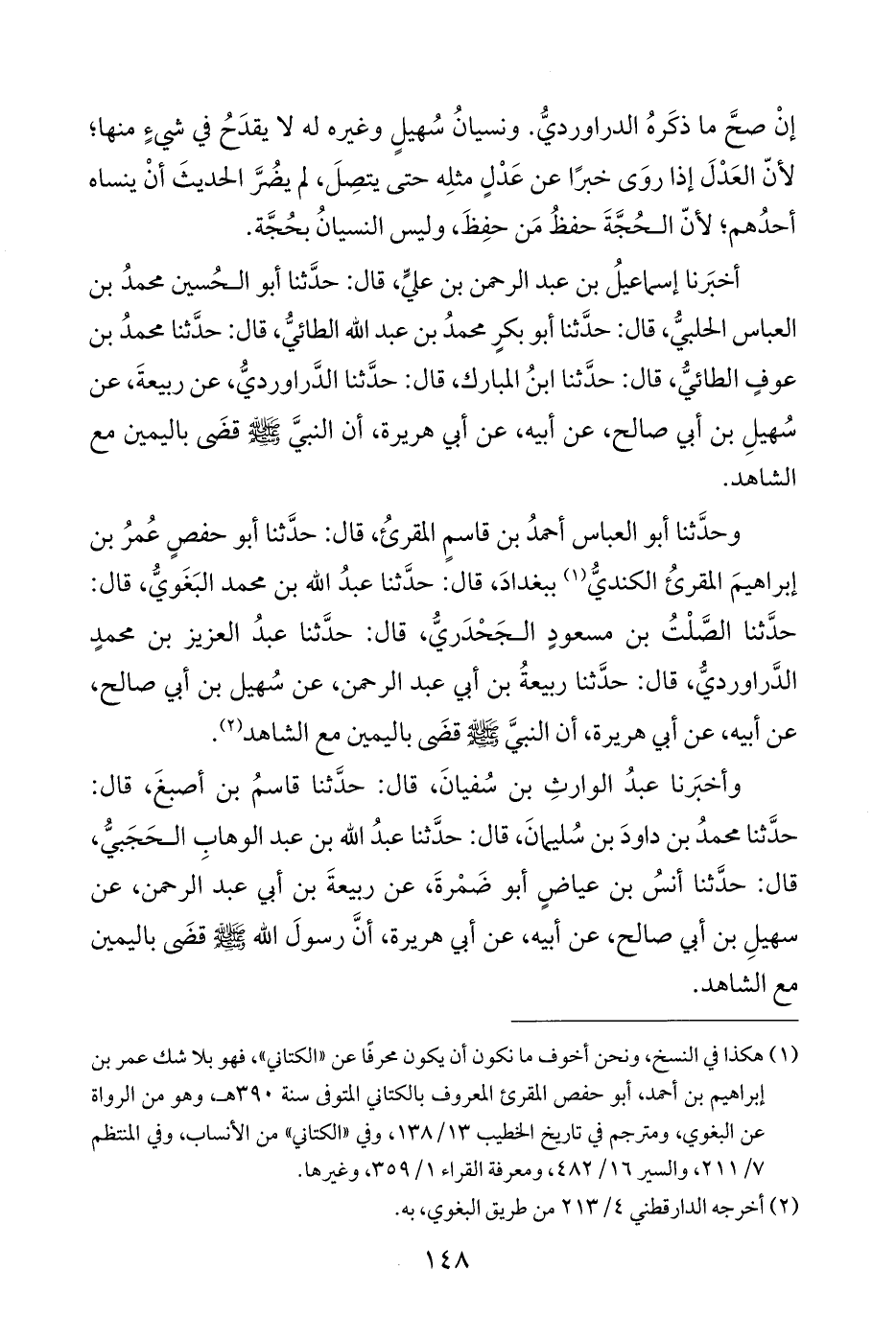 وحدَّثنا أبو العباس أحمدُ بن قاسمٍ المقرئُ، قال: حدَّثنا أبو حفصٍ عُمرُ بن إبراهيمَ المقرئُ الكنديُّ (¬١) ببغدادَ، قال: حدَّثنا عبدُ الله بن محمد البَغَويُّ، قال: حدَّثنا الصَّلْتُ بن مسعودٍ الجَحْدَريُّ، قال: حدَّثنا عبدُ العزيز بن محمدٍ الدَّراورديُّ، قال: حدَّثنا ربيعةُ بن أبي عبد الرحمن، عن سُهيل بن أبي صالح، عن أبيه، عن أبي هريرة، أن النبيَّ - صلى الله عليه وسلم - قضَى باليمين مع الشاهد (¬٢).
