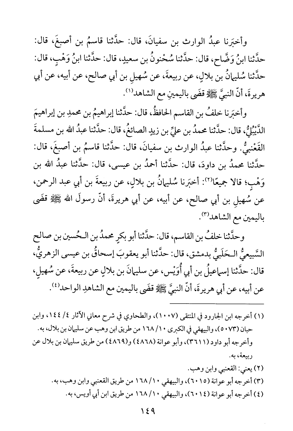 وأخبَرنا عبدُ الوارث بن سفيانَ، قال: حدَّثنا قاسمُ بن أصبغَ، قال: حدَّثنا ابنُ وَضَّاح، قال: حدَّثنا سُحْنونُ بن سعيدٍ، قال: حدَّثنا ابنُ وَهْبٍ، قال: حدَّثنا سُليمانُ بن بلالٍ، عن ربيعةَ، عن سُهيلِ بن أبي صالح، عن أبيه، عن أبي هريرةَ، أنّ النبيَّ - صلى الله عليه وسلم - قضَى باليمينِ مع الشاهد (¬١).