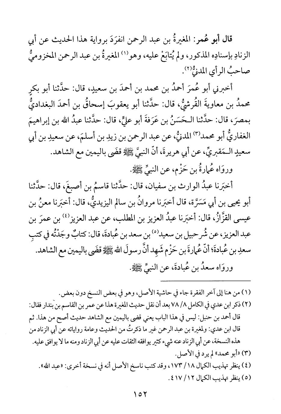 (¬٢) ذكر ابن عدي في الكامل ٨/ ٧٨ بعد أن نقل حديث المغيرة هذا عن عمر بن القاسم بن بندار فقال: قال أحمد بن حنبل: ليس في هذا الباب يعني قضى باليمين مع الشاهد حديث أصح من هذا. ثم قال ابن عدي: ولمغيرة بن عبد الرحمن غير ما ذكرتُ من الحديث وعامة رواياته عن أبي الزناد من هذه النسخة، عن أبي الزناد عنه شيء كثير يوافقه الثقات عليه عن أبي الزناد ومنه ما لا يوافق عليه.