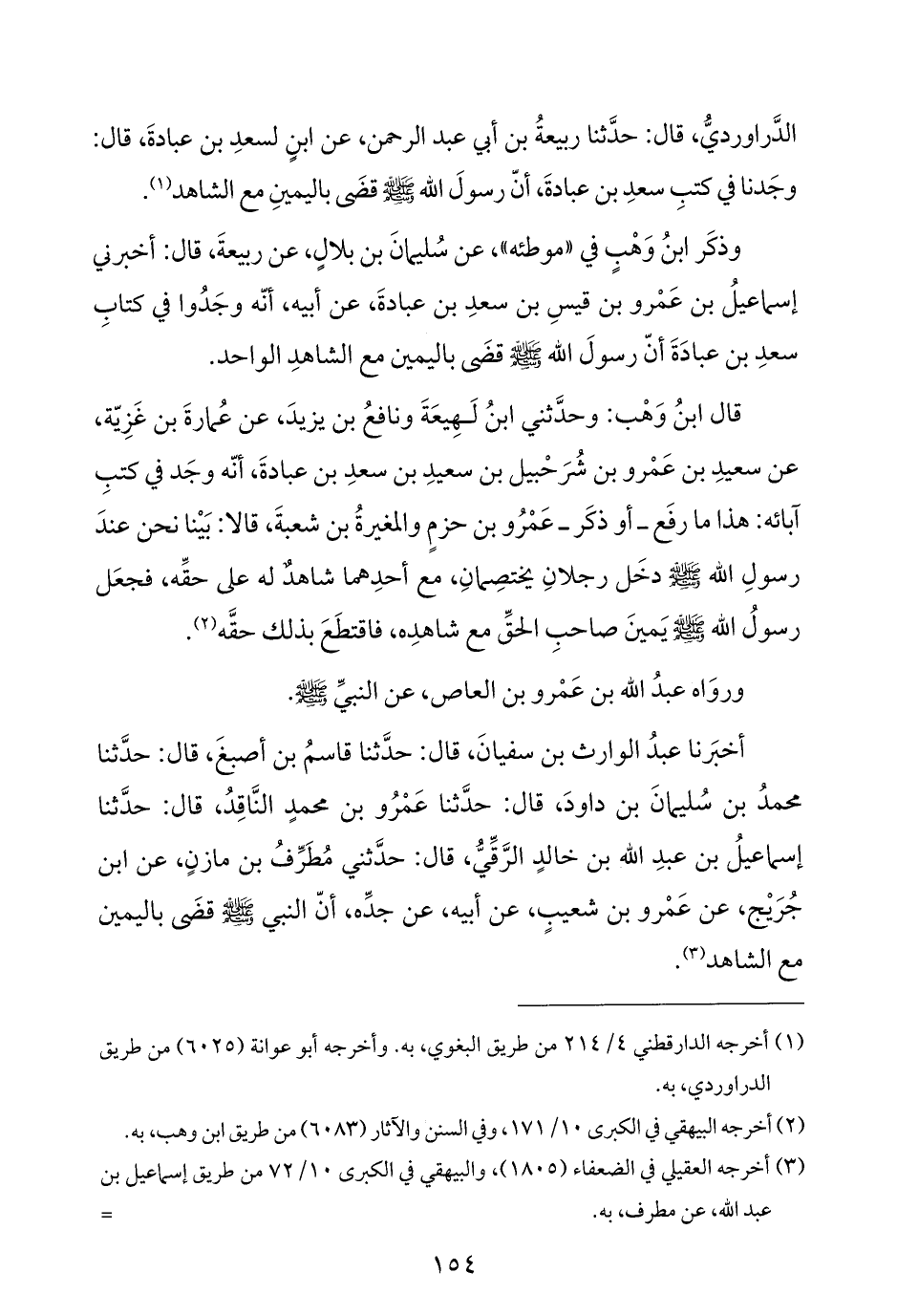 الدَّراورديُّ، قال: حدَّثنا ربيعةُ بن أبي عبد الرحمن، عن ابنٍ لسعدِ بن عبادةَ، قال: وجَدنا في كتبِ سعدِ بن عبادةَ، أنّ رسولَ الله - صلى الله عليه وسلم - قضَى باليمينِ مع الشاهد (¬١).